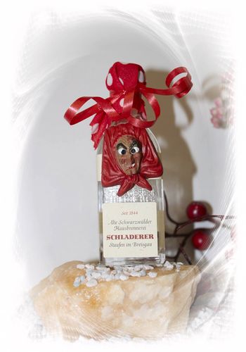 Hier bieten wir Ihnen eine schöne Miniaturflasche aus der Schwarzwaldbrennerei Schladerer mit einem Miniaturmäskle aus den Schwäbischen und Schwarzwälder Fastnachtsgeschichten.