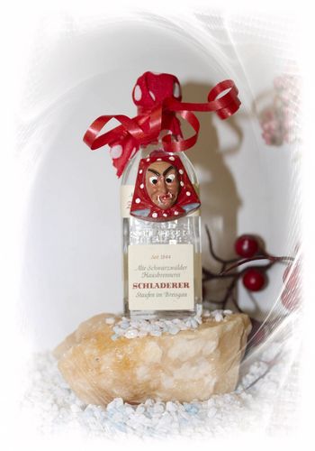 Hier bieten wir Ihnen eine schöne Miniaturflasche aus der Schwarzwaldbrennerei Schladerer mit einem Miniaturmäskle aus den Schwäbischen und Schwarzwälder Fastnachtsgeschichten.