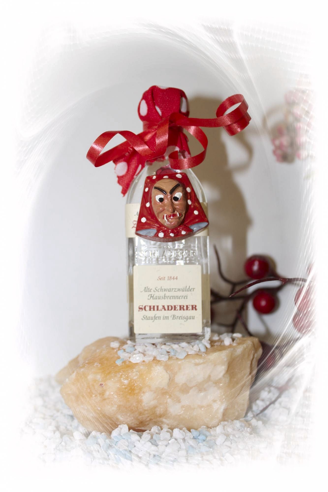 Hier bieten wir Ihnen eine schöne Miniaturflasche aus der Schwarzwaldbrennerei Schladerer mit einem Miniaturmäskle aus den Schwäbischen und Schwarzwälder Fastnachtsgeschichten.