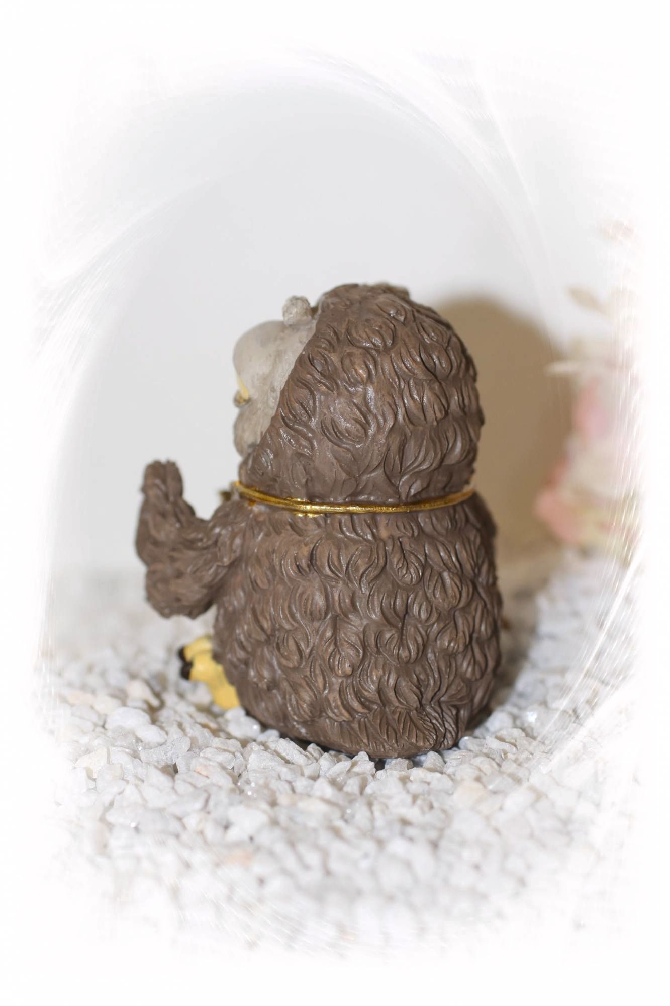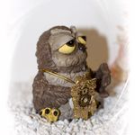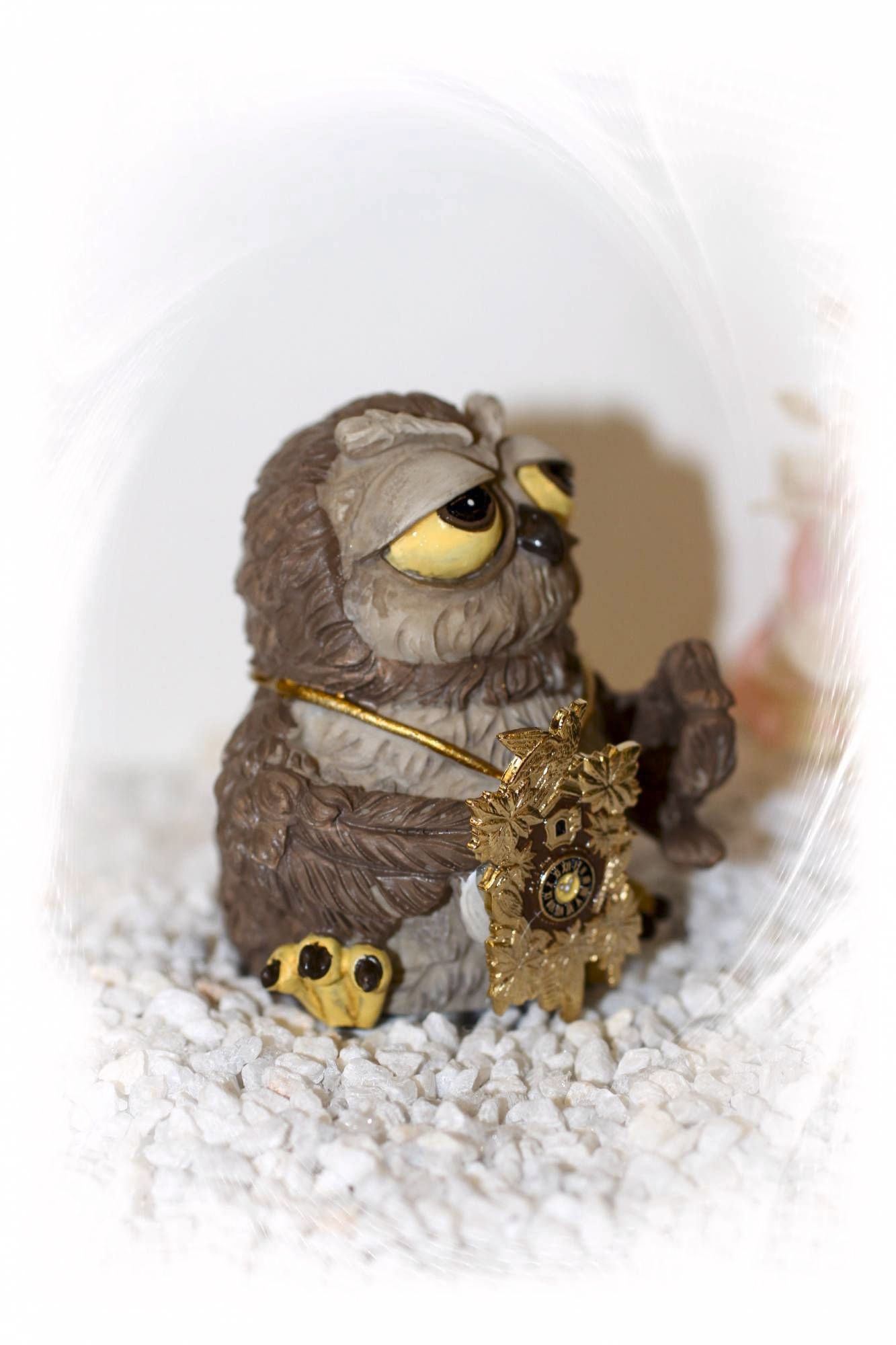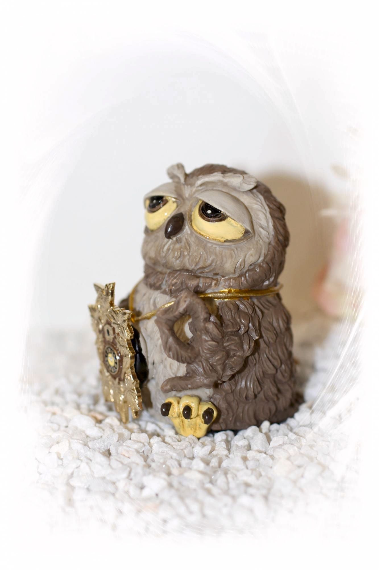 Diese Eule mit einer handgefertigter goldfarbener Kuckucksuhr.