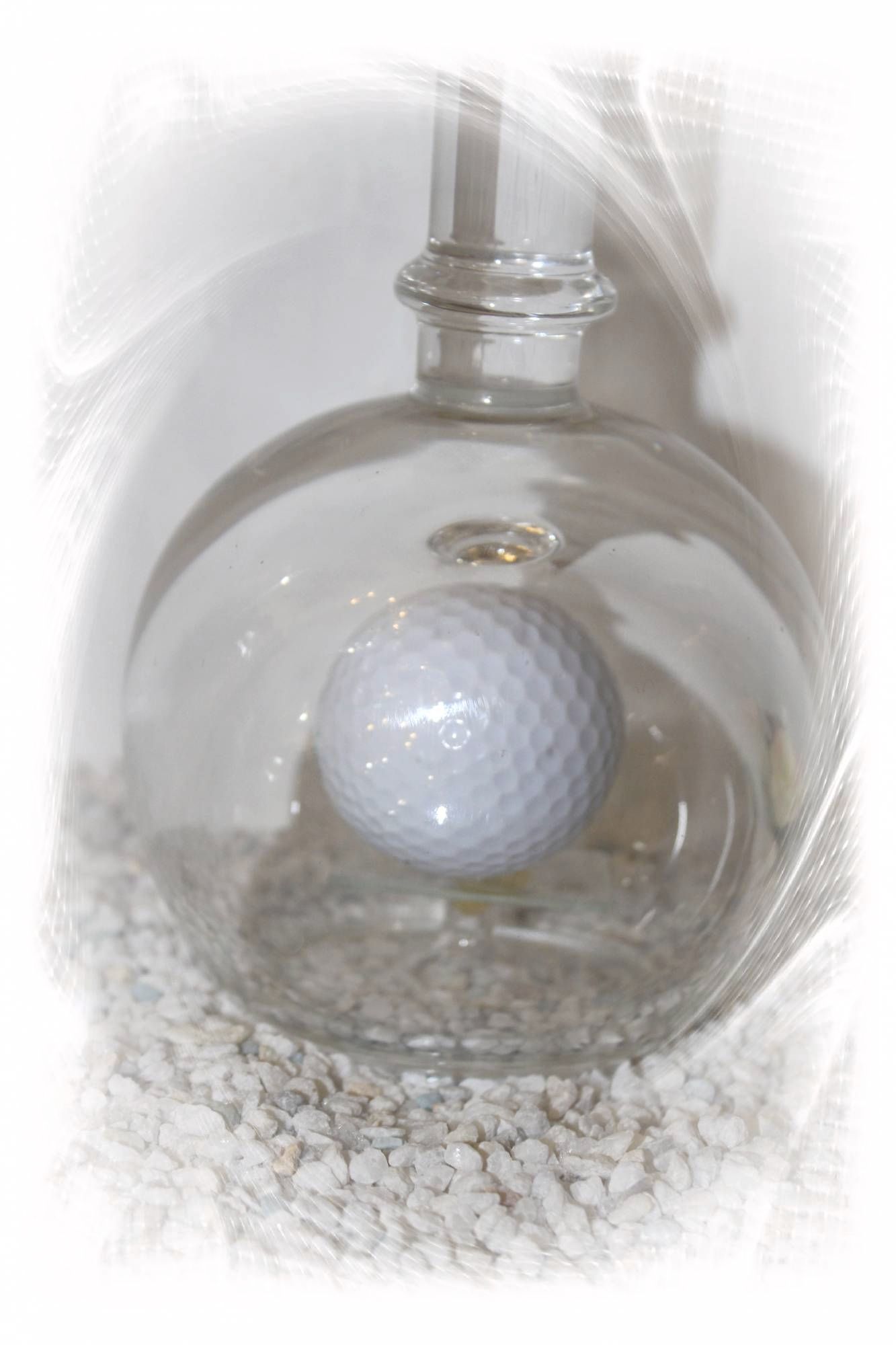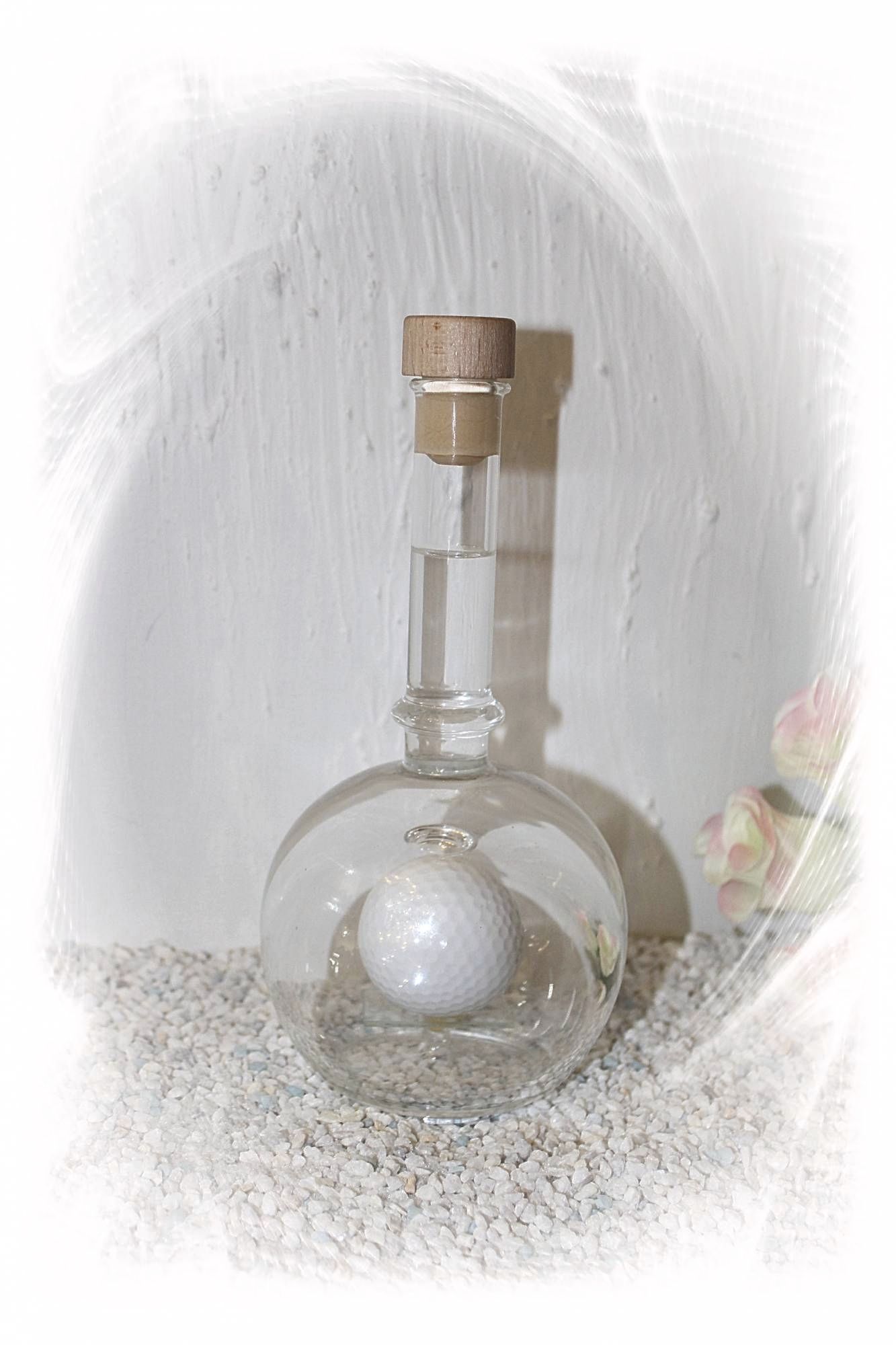 Hier zeigen wir Ihnen eine edle gefertigte, mundgeblasene Glasflasche mit einem neutralen Golfball