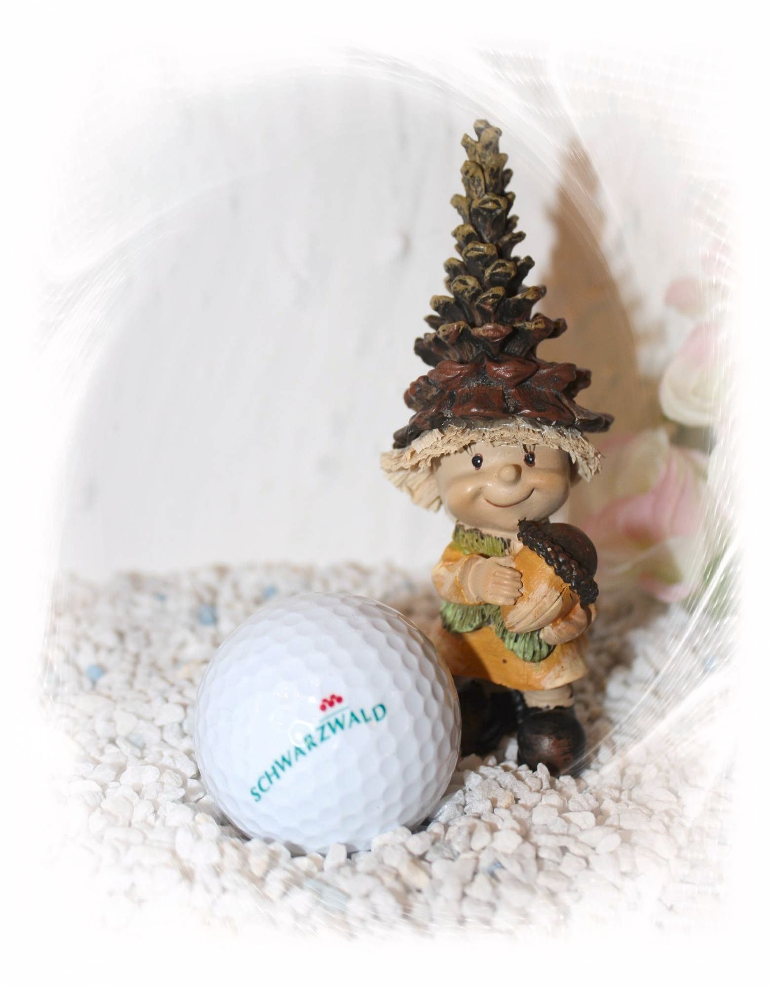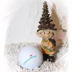 Ein ganz bezaubernder Tannenzapfenwichtel aus Polystone mit einem echten Golfball.