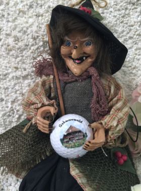 Schwarzwälder "Golfhexe" mit Golfball Schwarzwaldhaus