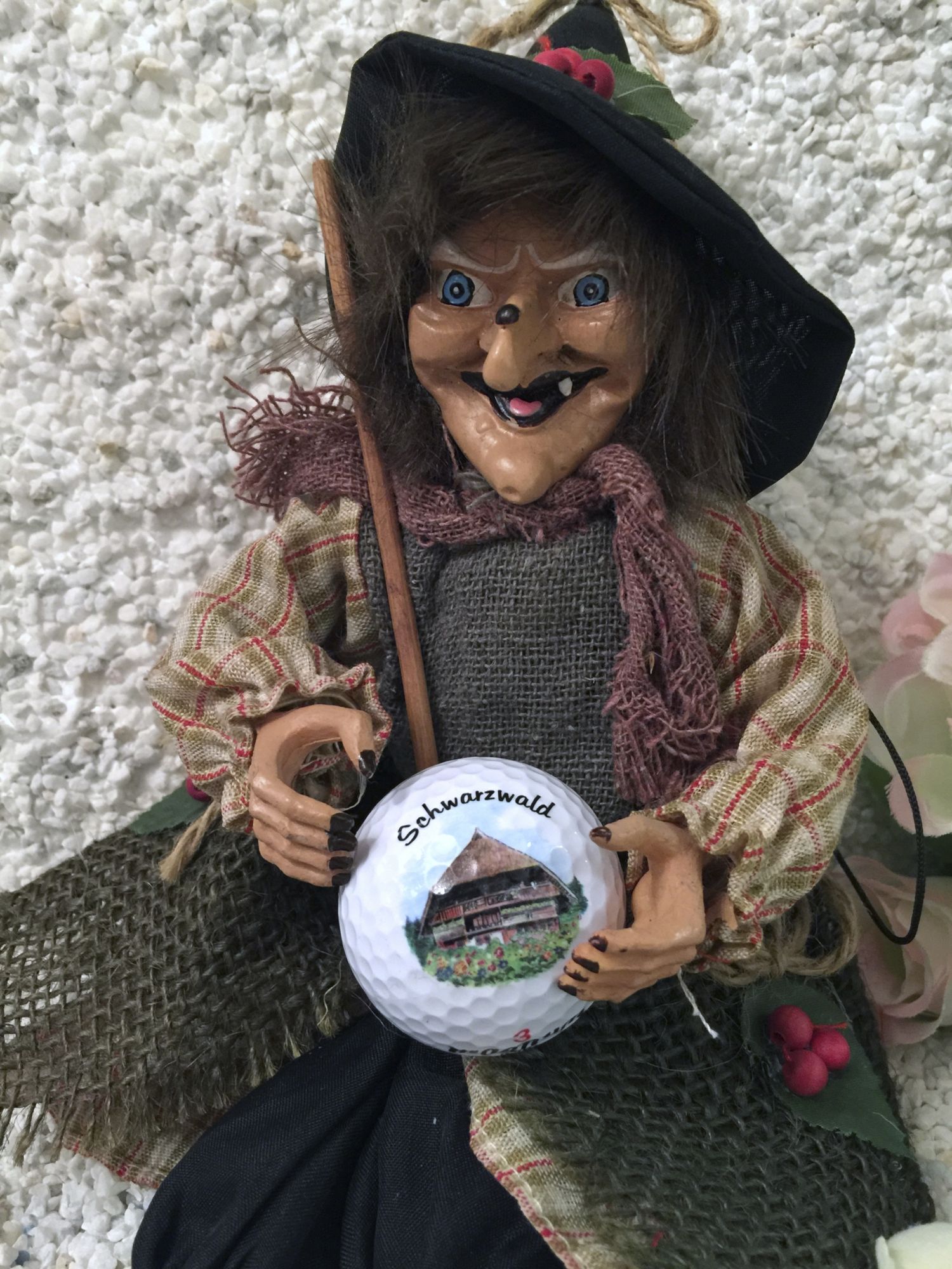 Die Hexe hat einen Golfball mit Schwarzwald-Motiv.