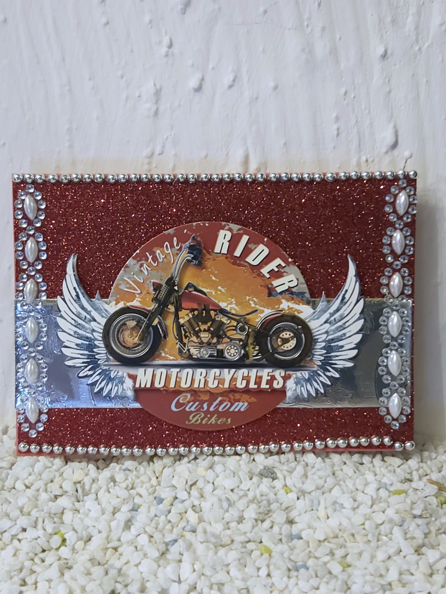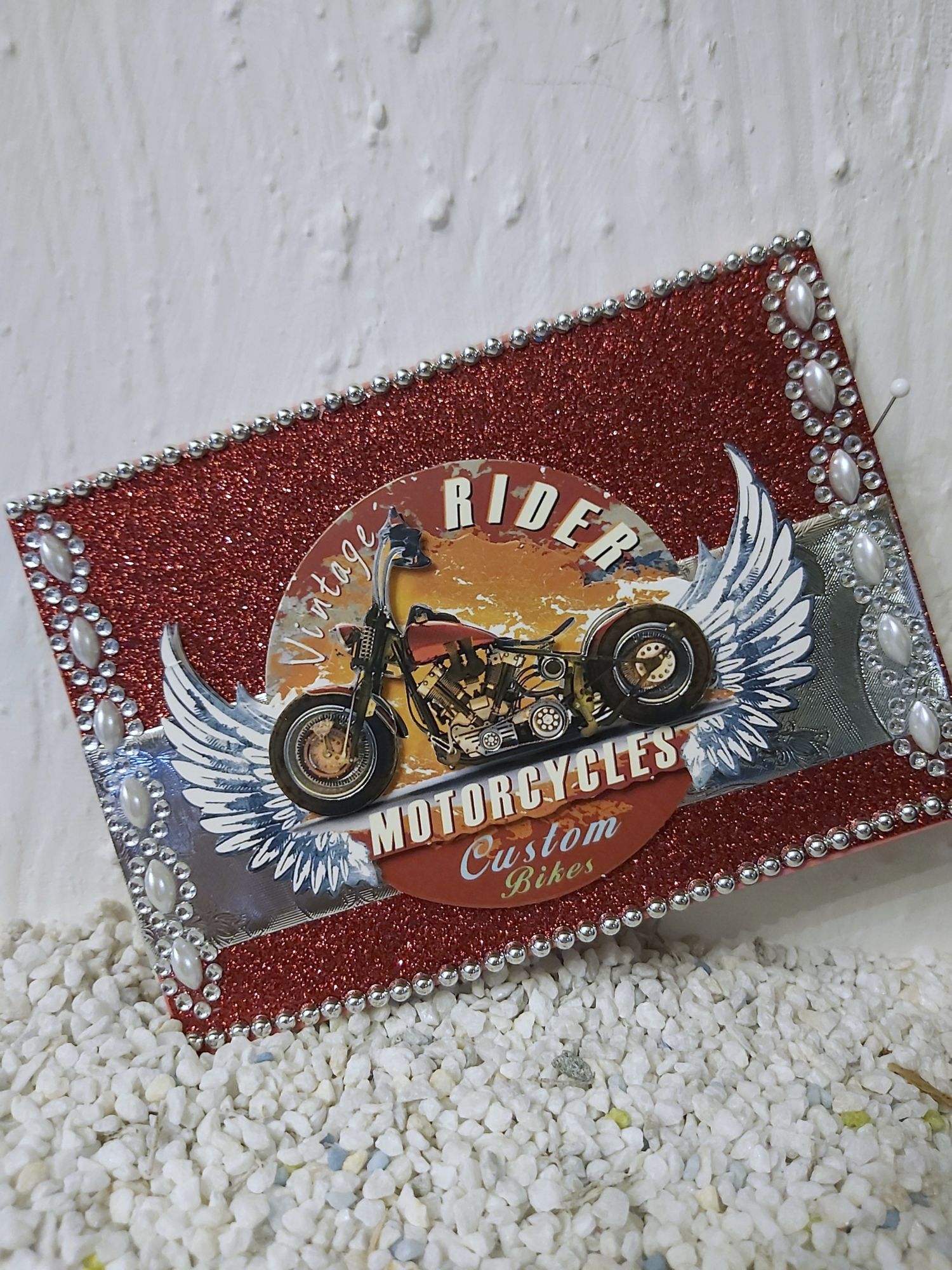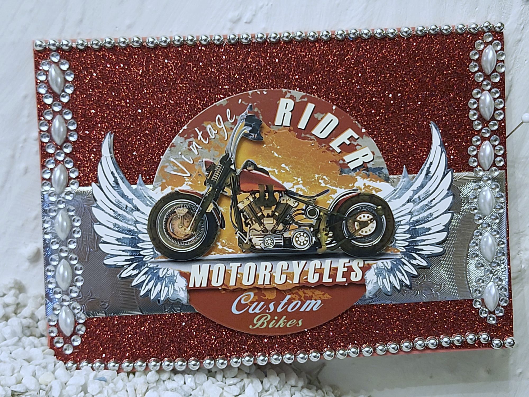 Material: Karton, Papier, Perlen, Schmucksteinchen