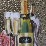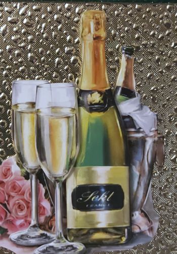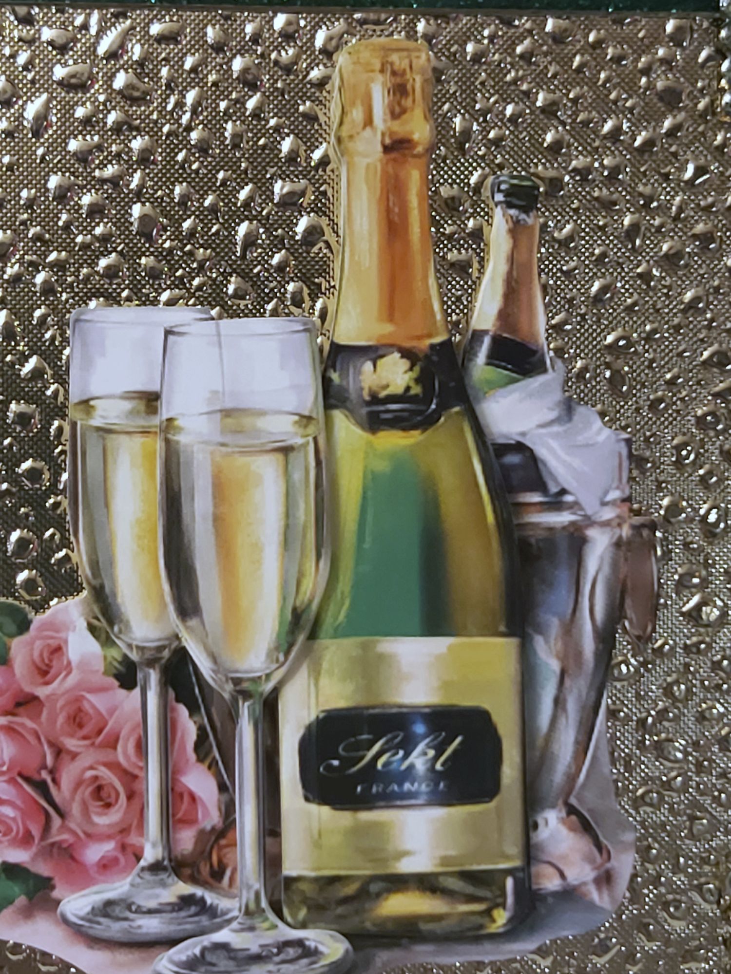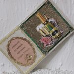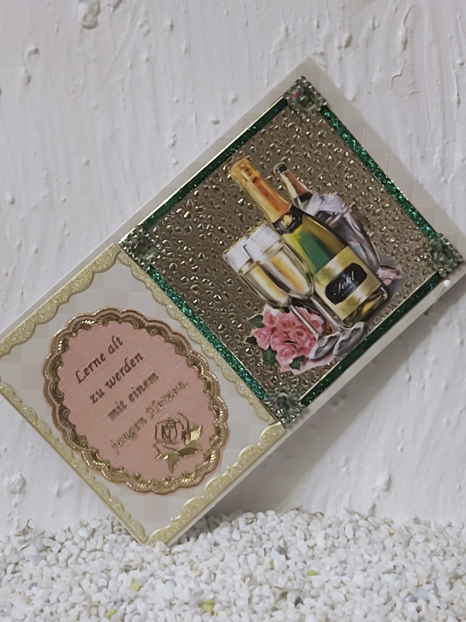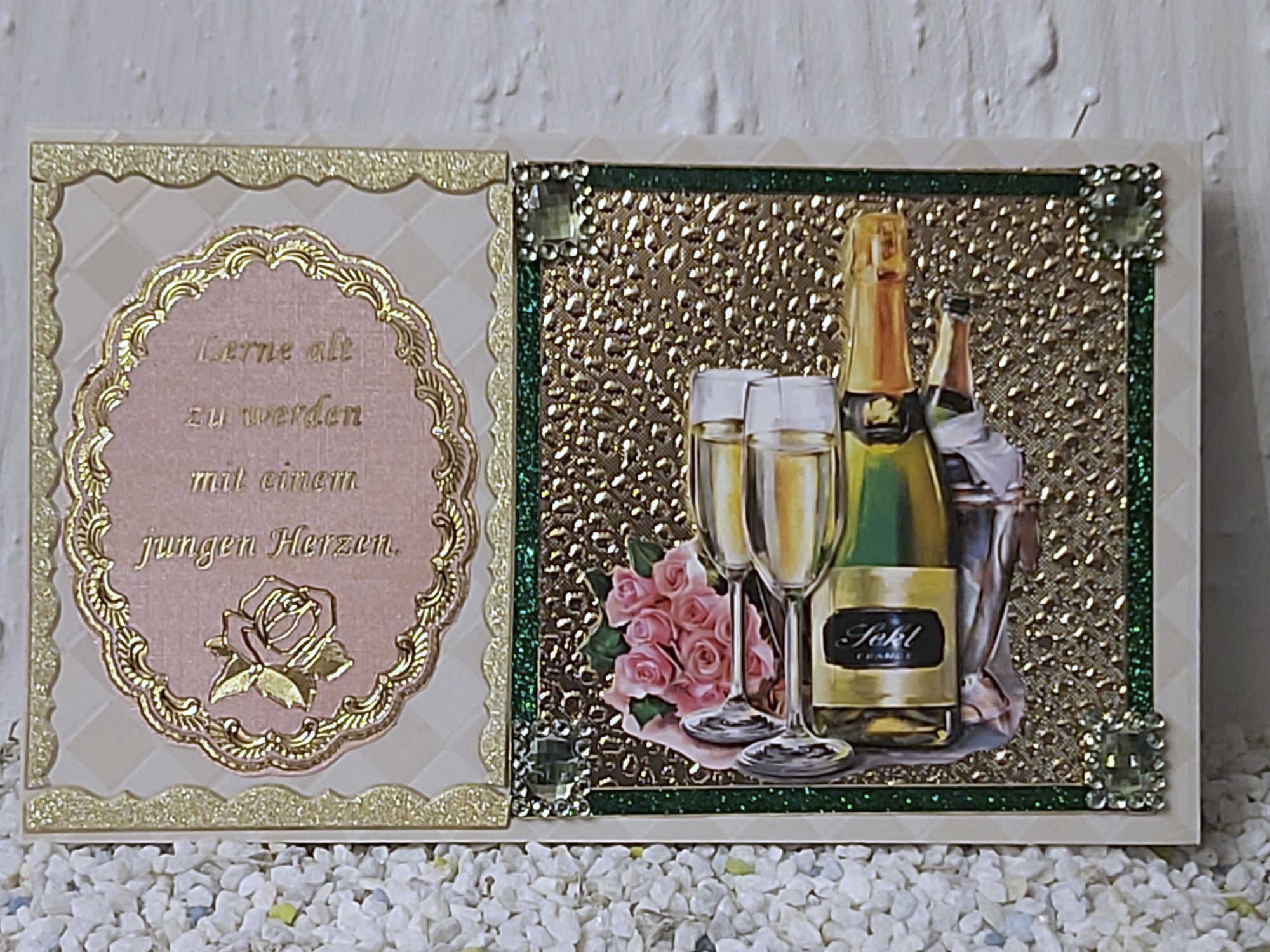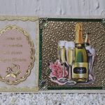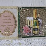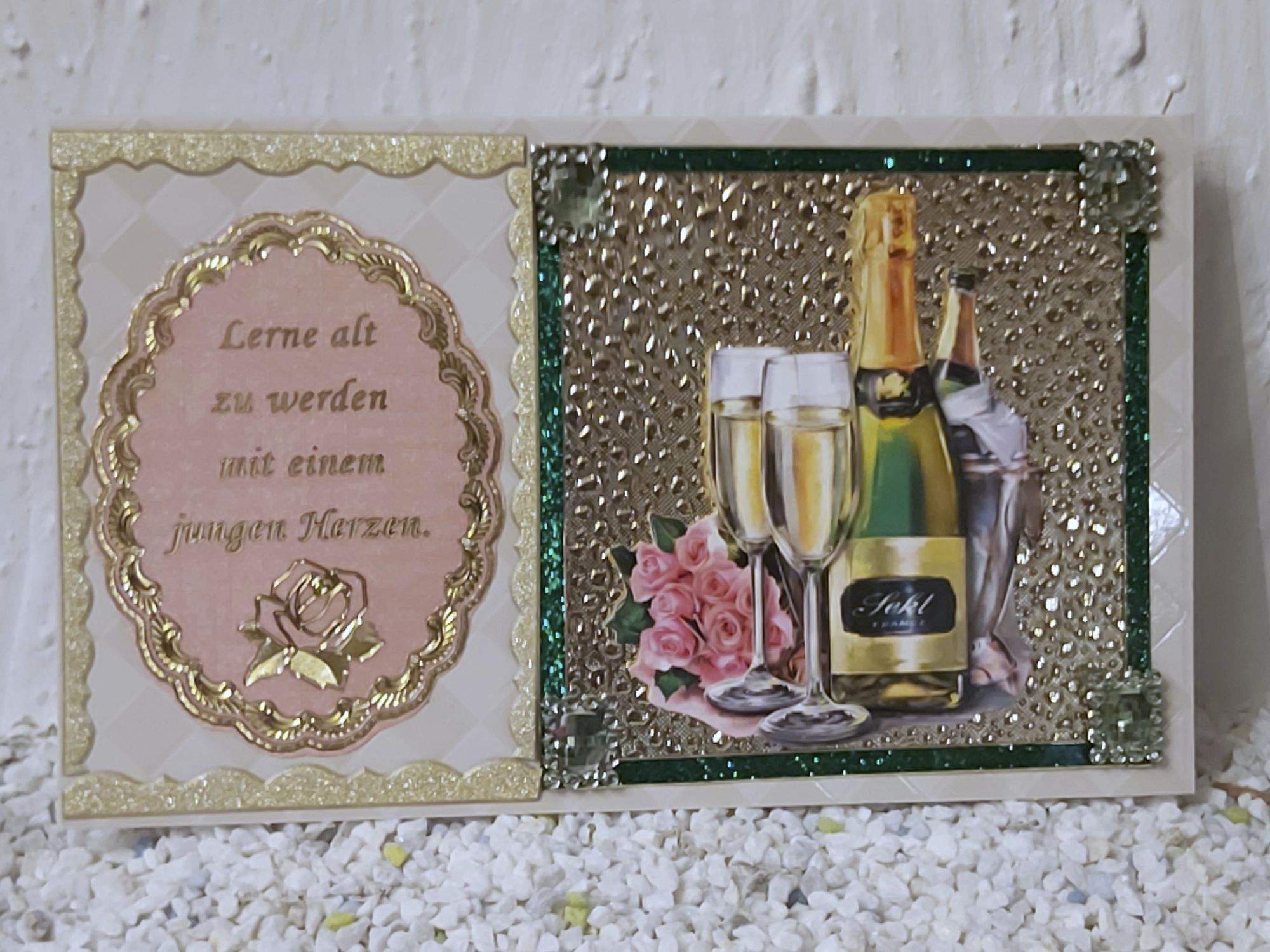 Karte mit Spuch, Sekglas,Flasche und Blumenstrauss