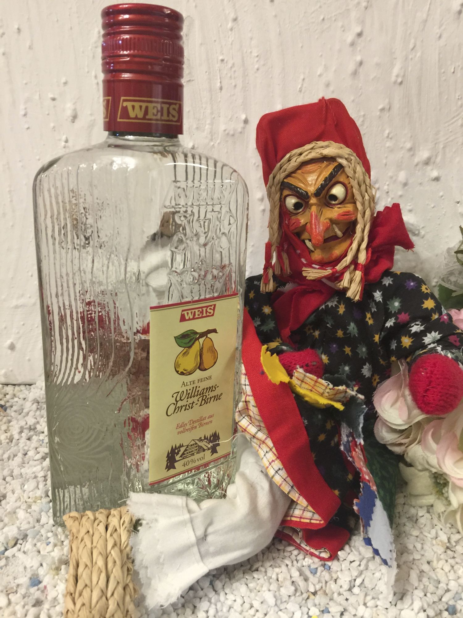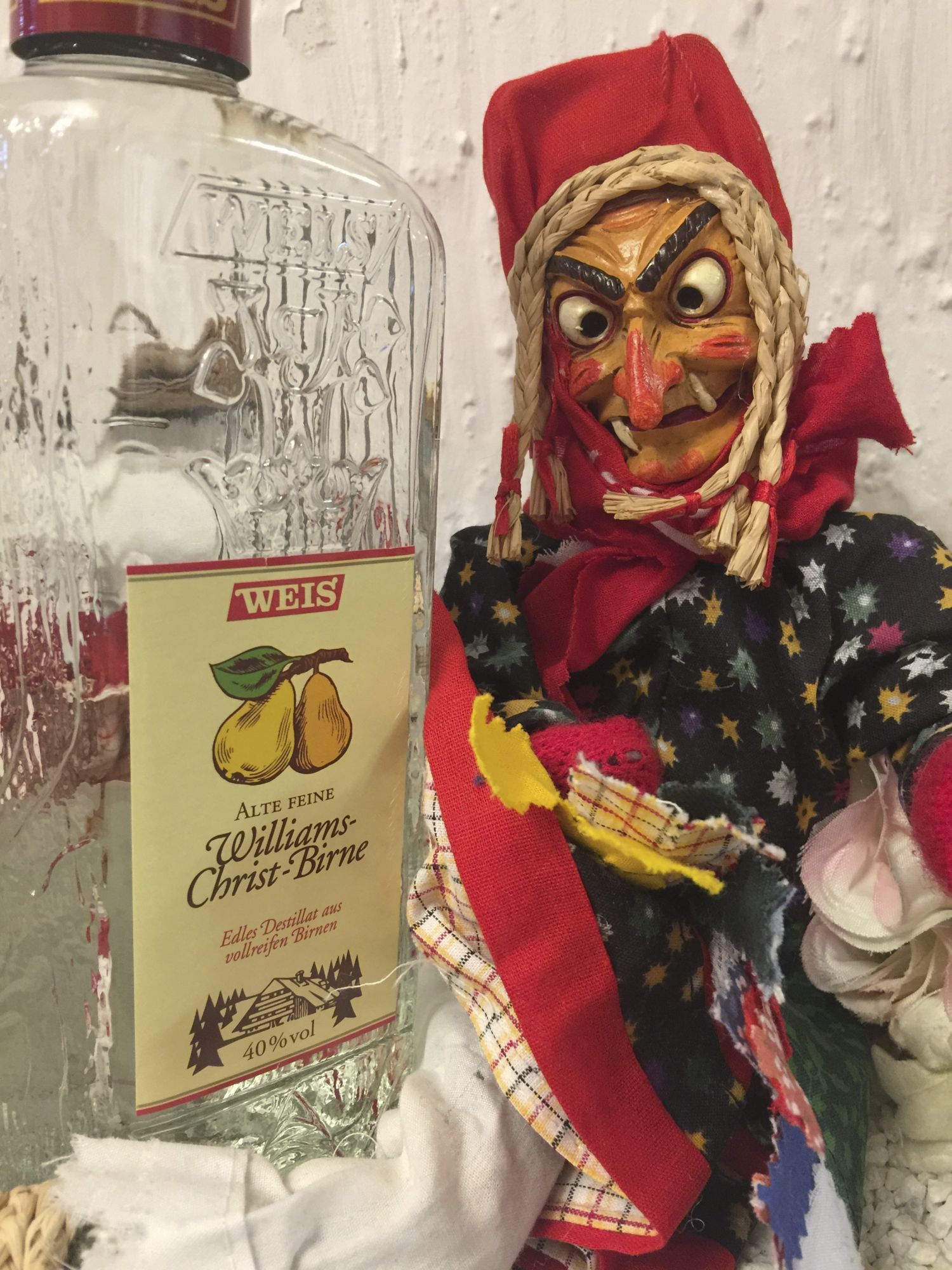 Der Begleiter dieser frechen Hexe ist ein feines altes Williams Christ Birnenschnäpsle