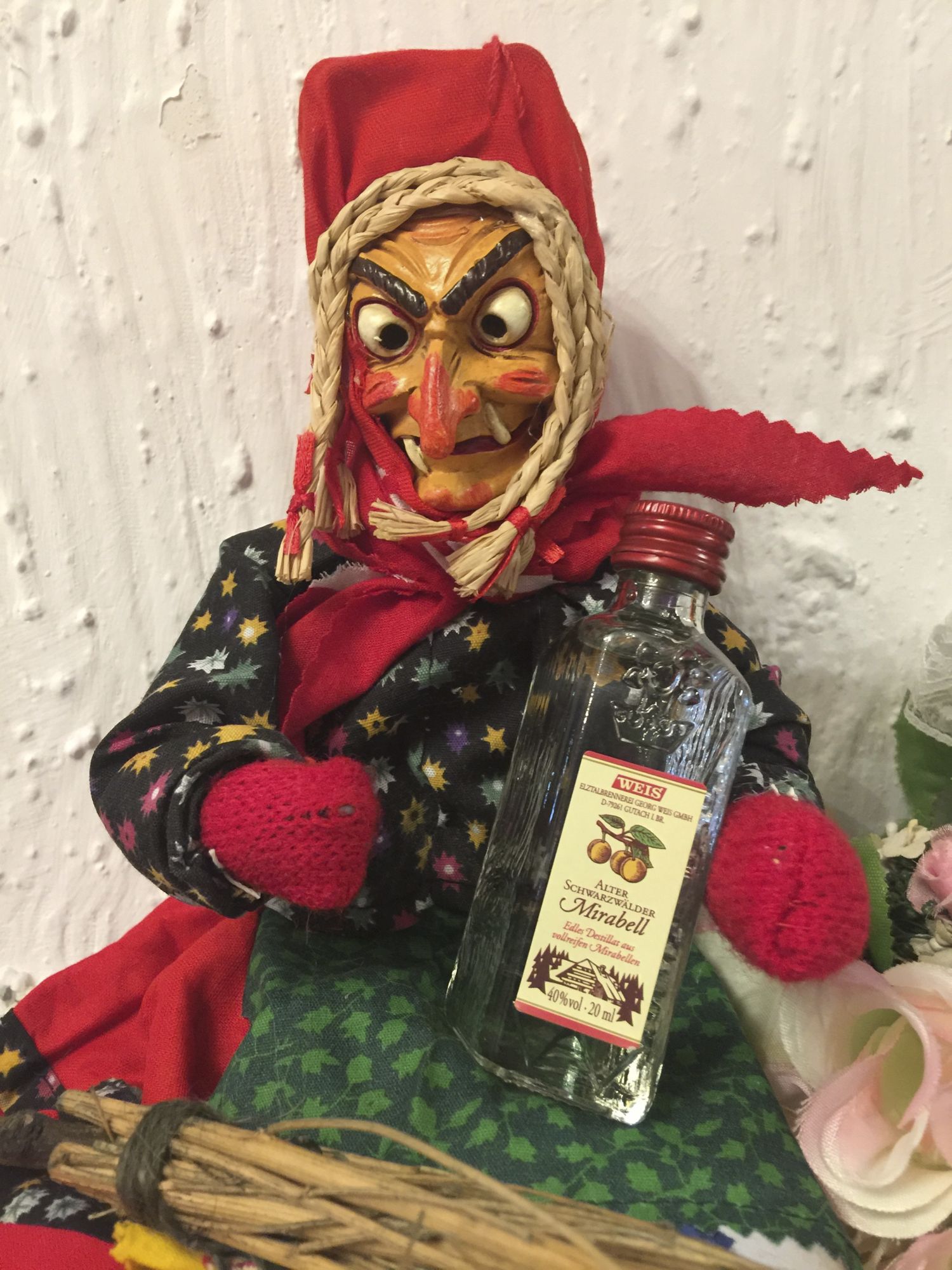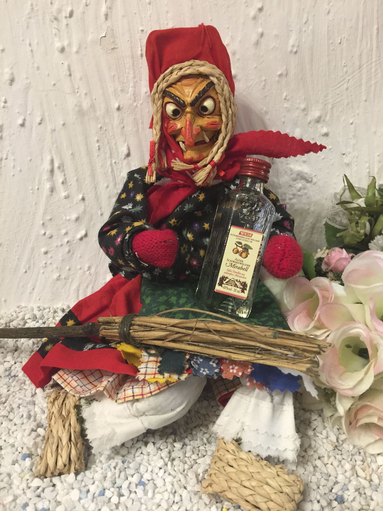 Die freche Hexe hat ein kleines rustikales Schnäpsle dabei.