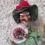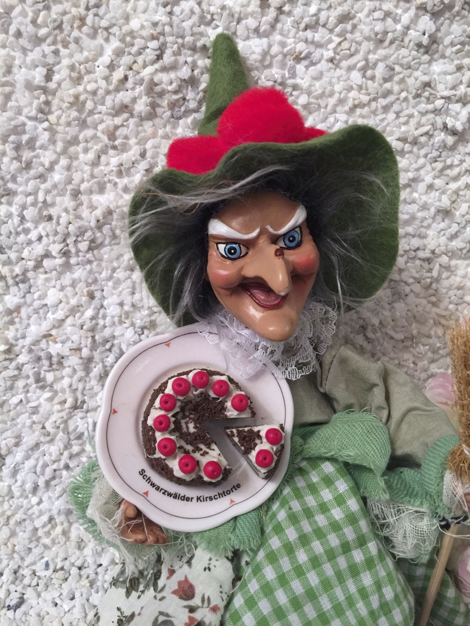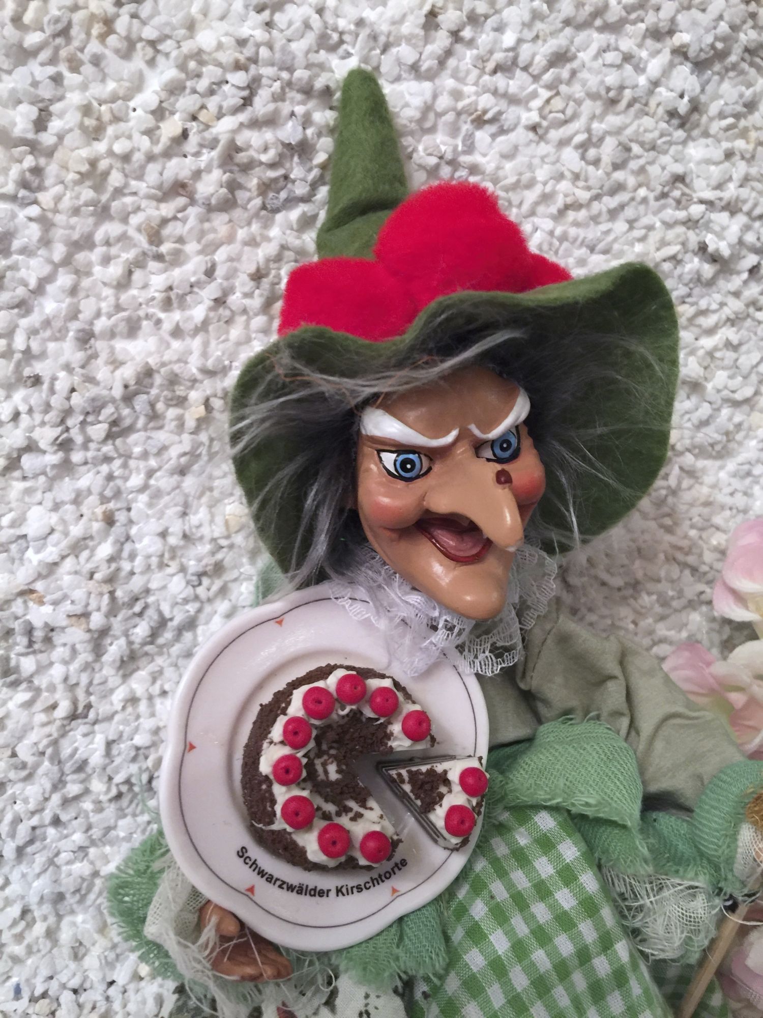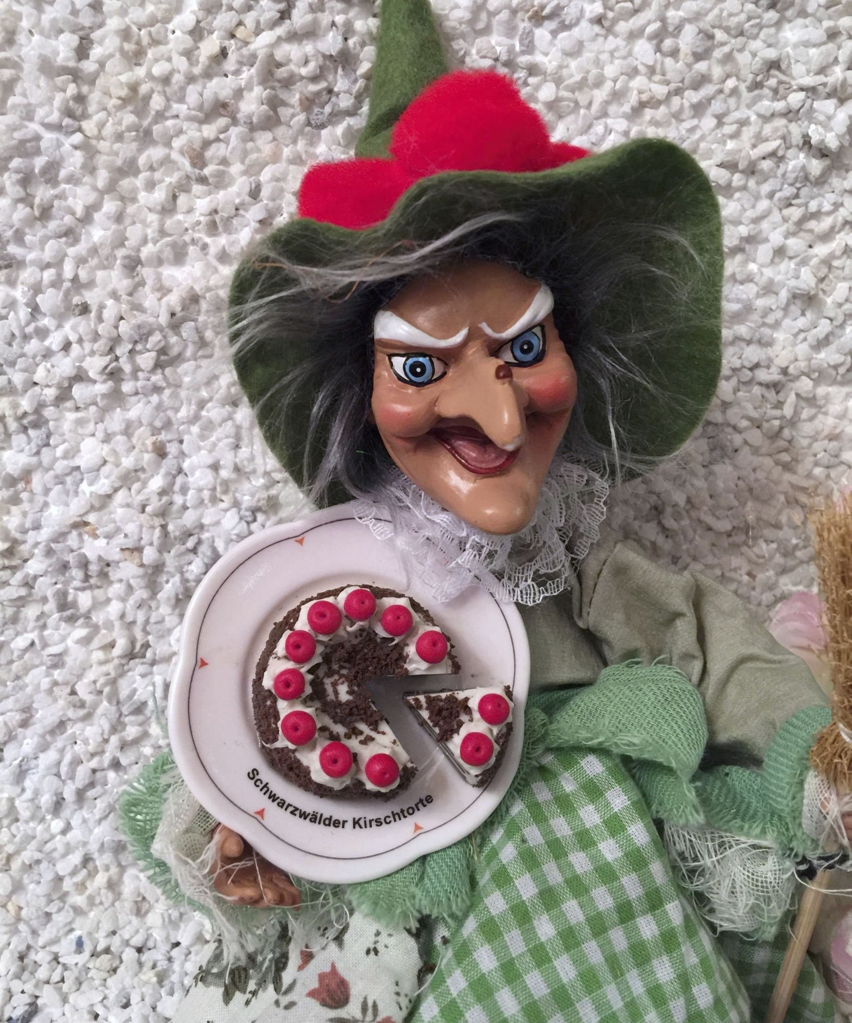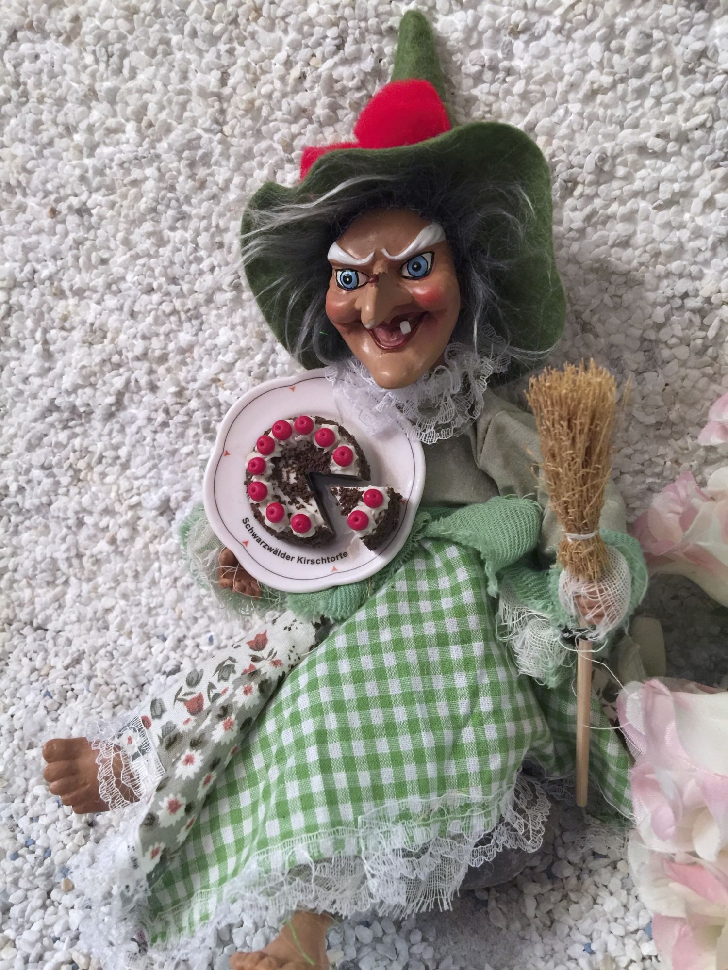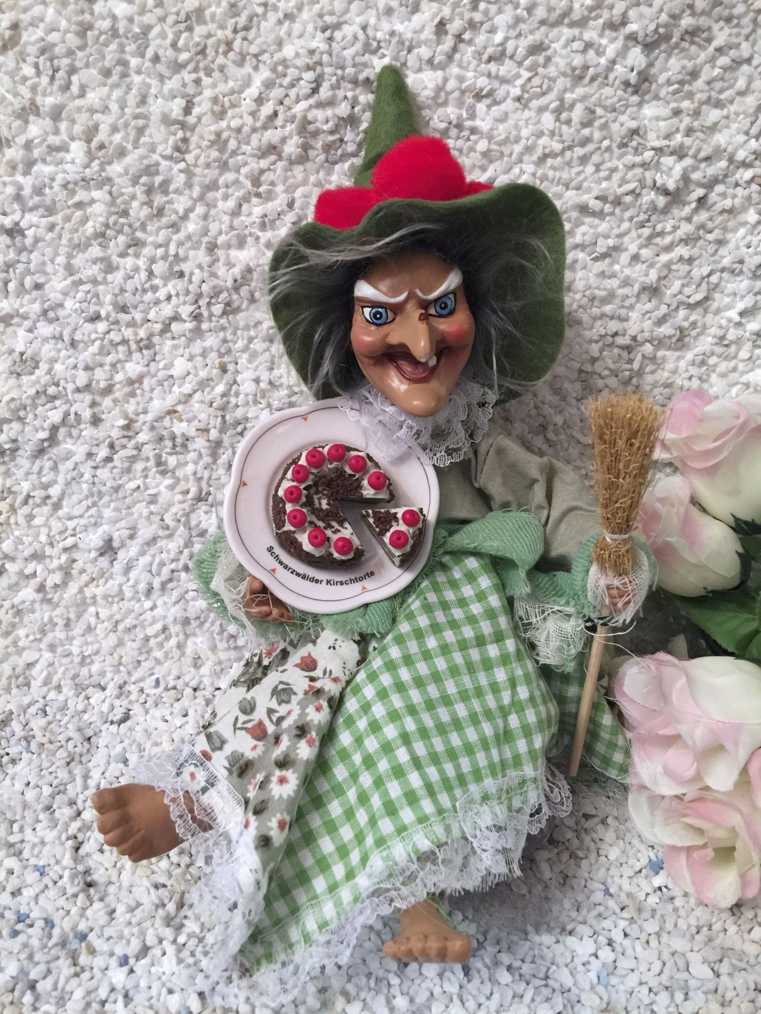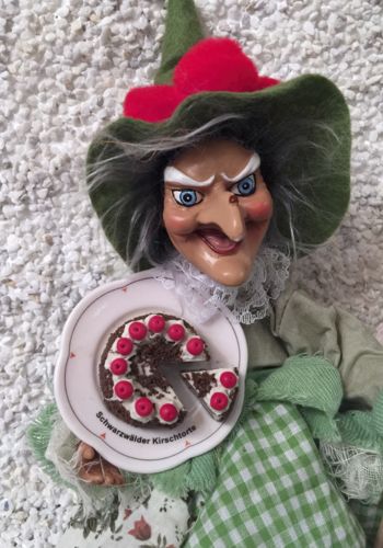 Hier zeigen wir Ihnen eine fetzig rustikale Hexe mit Spitzhut und roten schwarzwälder Bollen, das Zeichen des Schwarzwaldes.