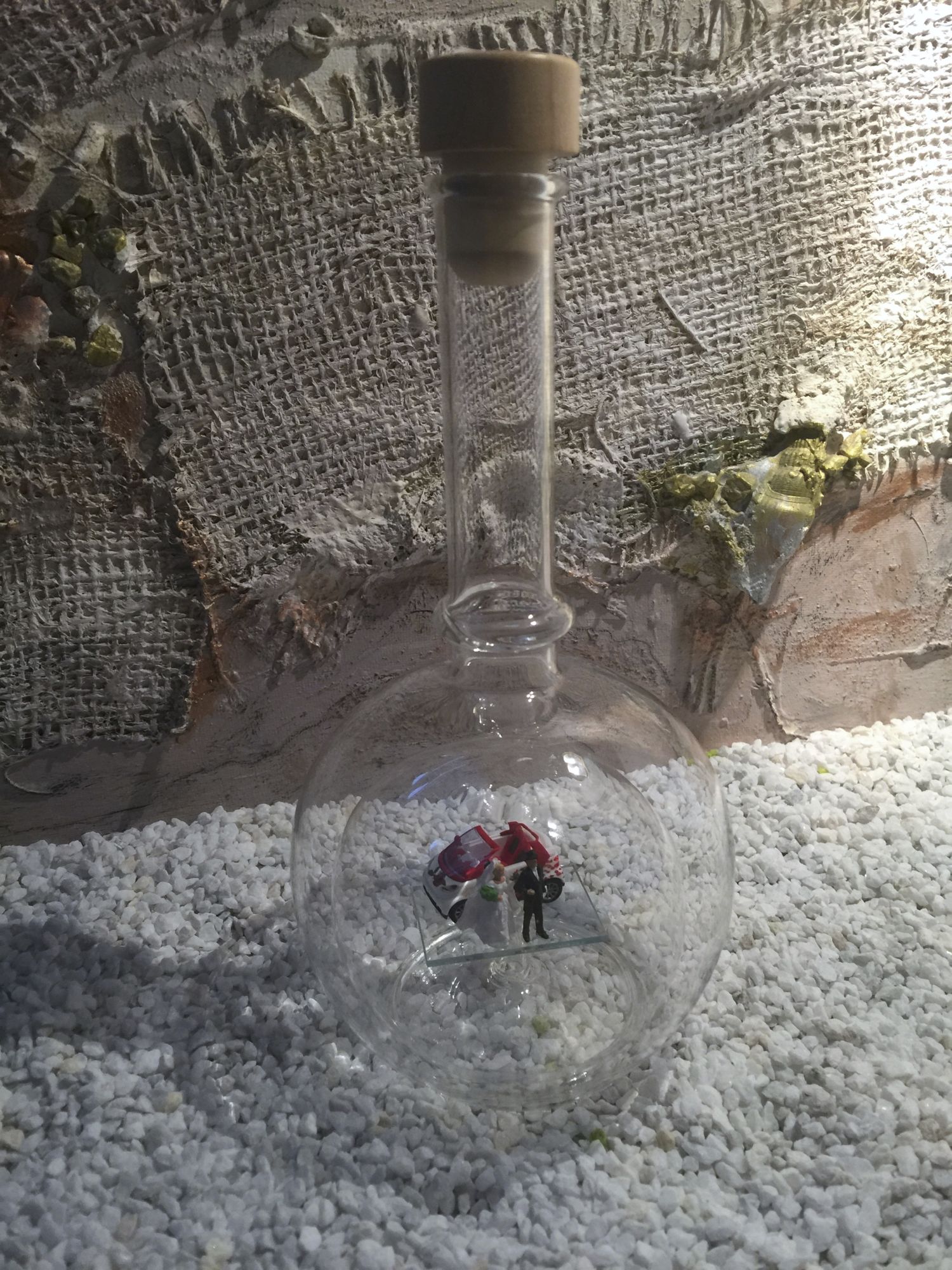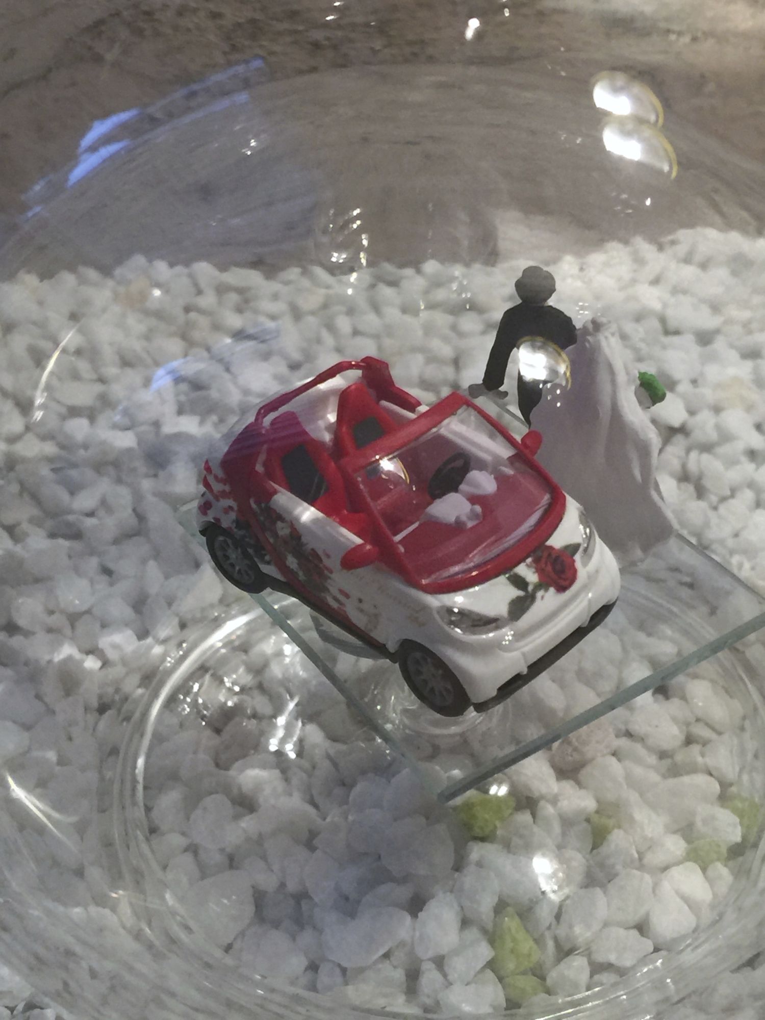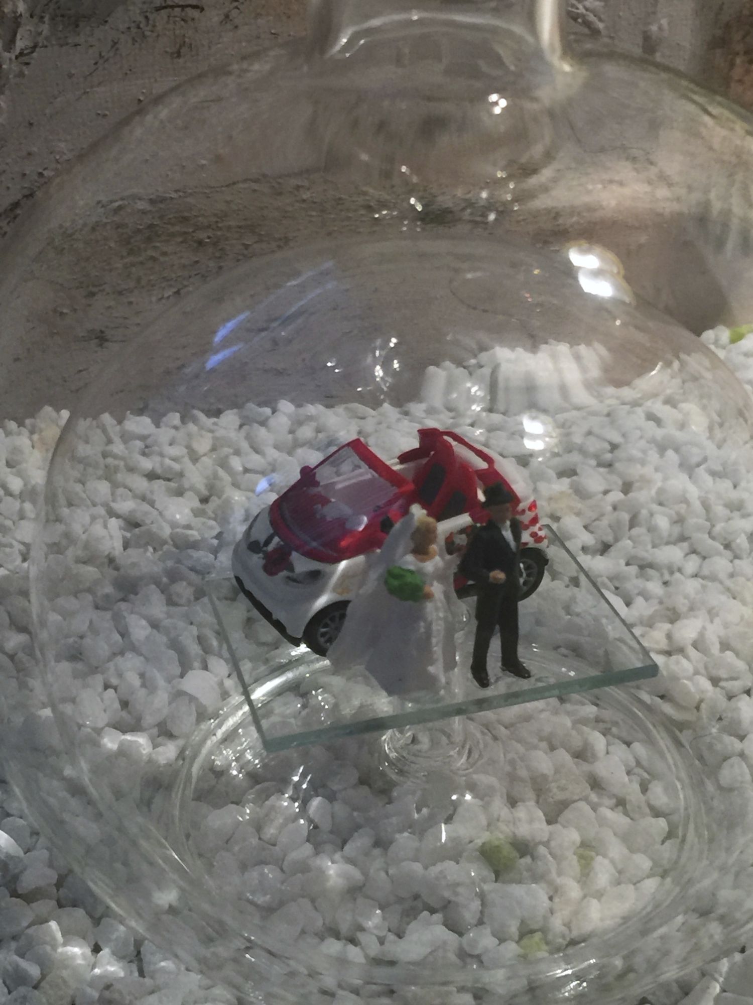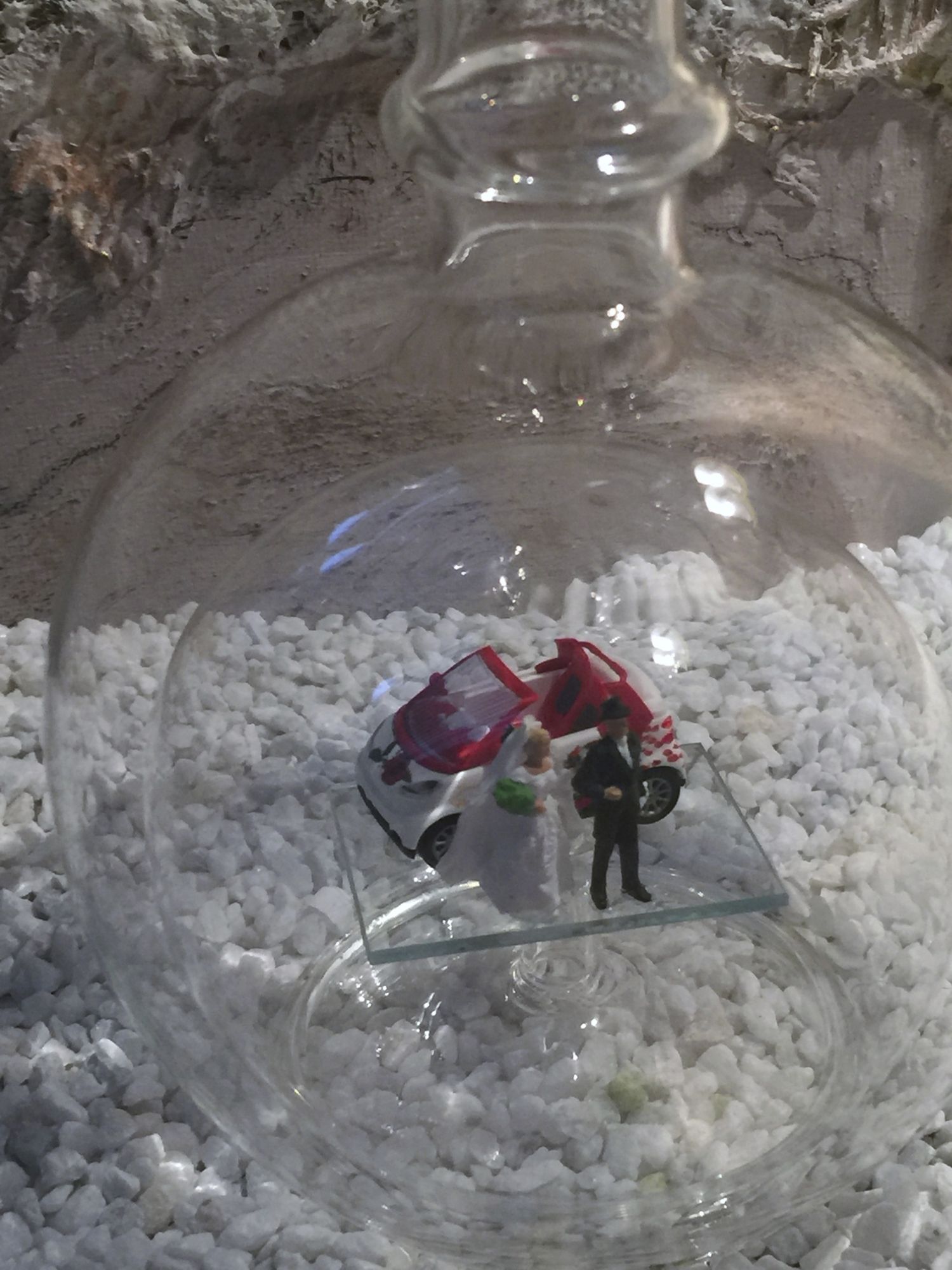 Hier zeigen wir Ihnen eine edle gefertigte, mundgeblasene Glasflasche mit einem Modelfahrzeug und Hochzeitspaar.