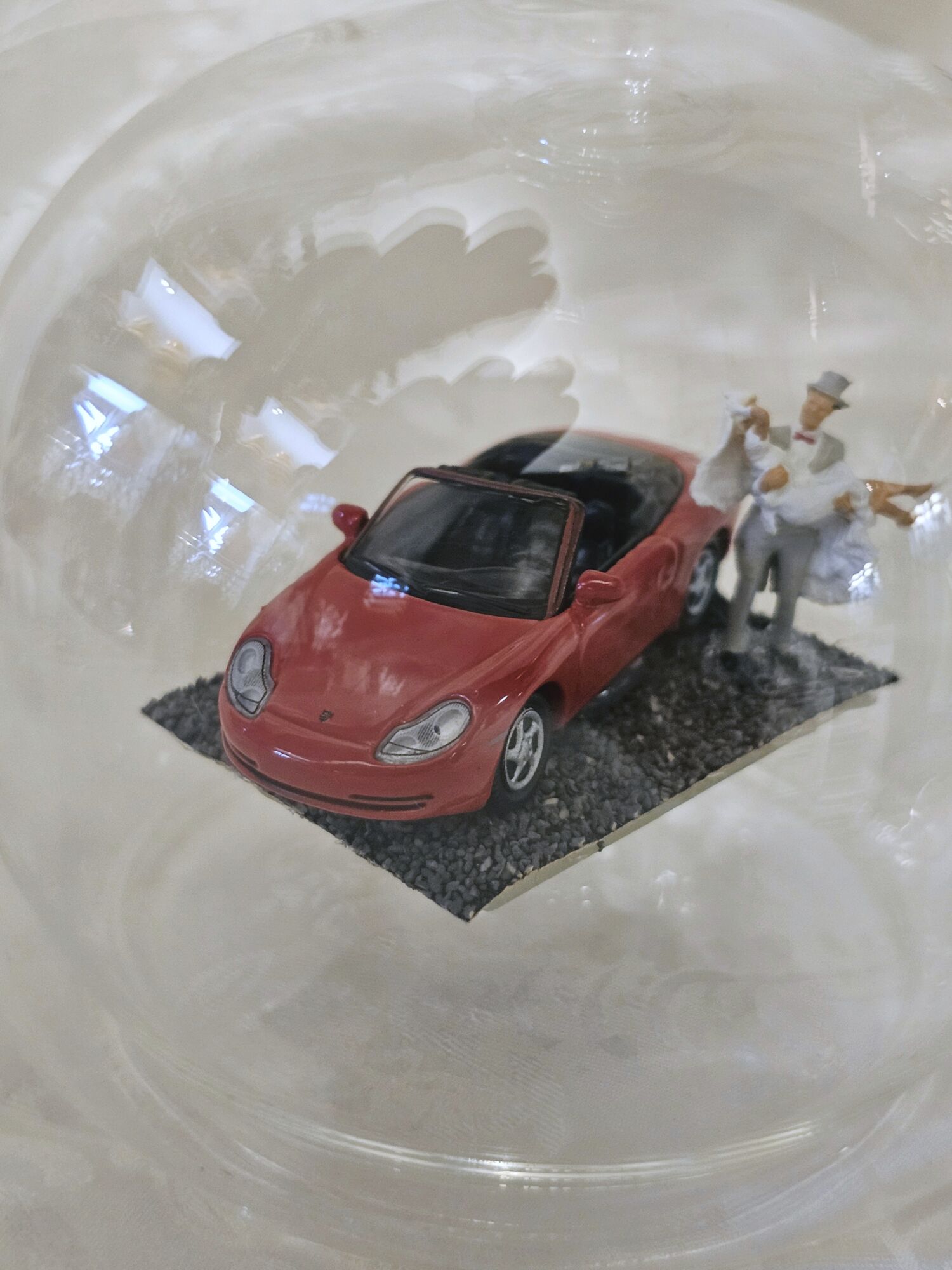 Hier zeigen wir Ihnen eine edle gefertigte, mundgeblasene Glasflasche mit einem Modelfahrzeug und Hochzeitspaar.