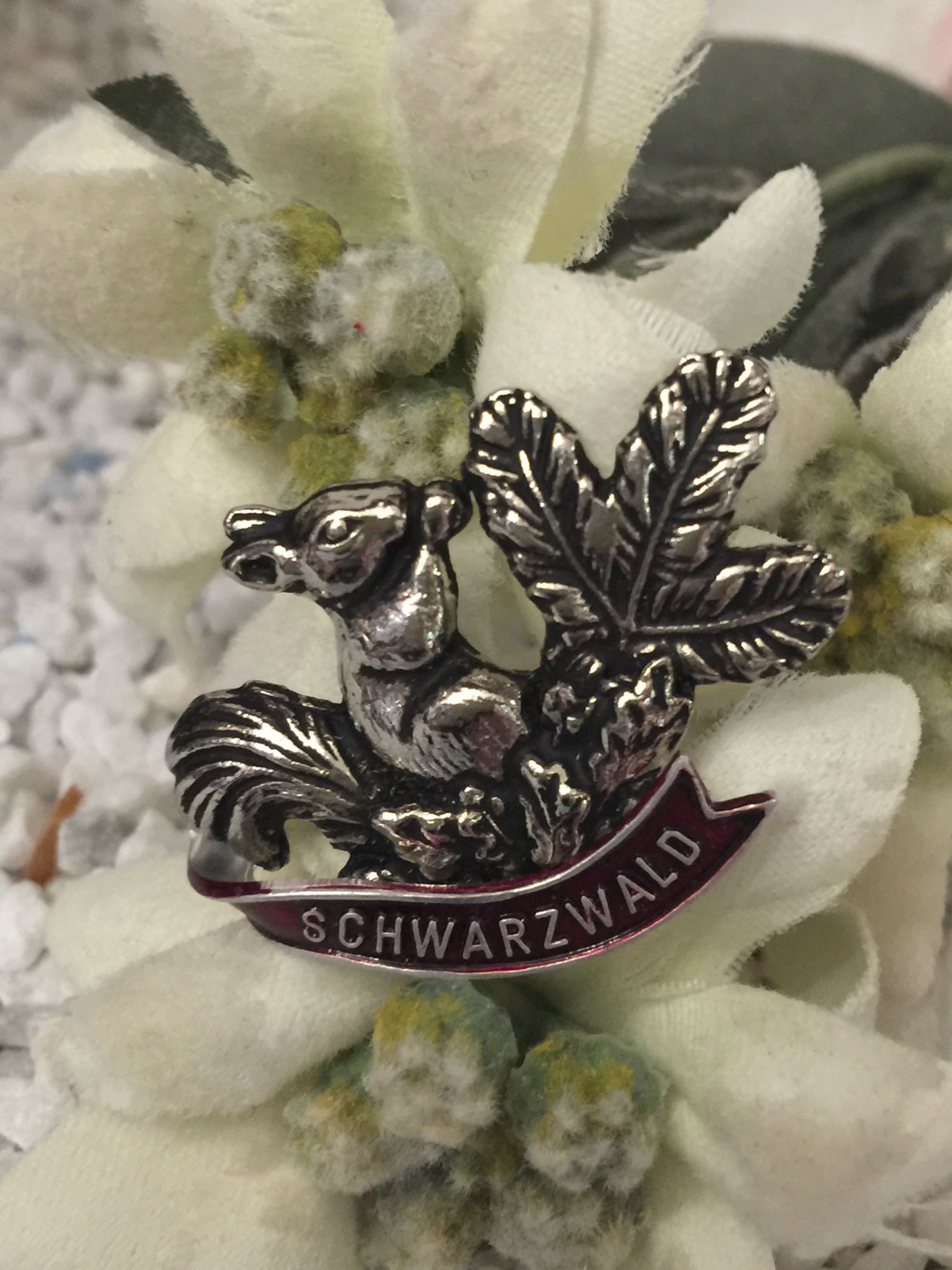 Hier zeigen wir Ihnen eine sehr schöne Hutnadel mit edlem Schwarzwälder Eichhörnchen.