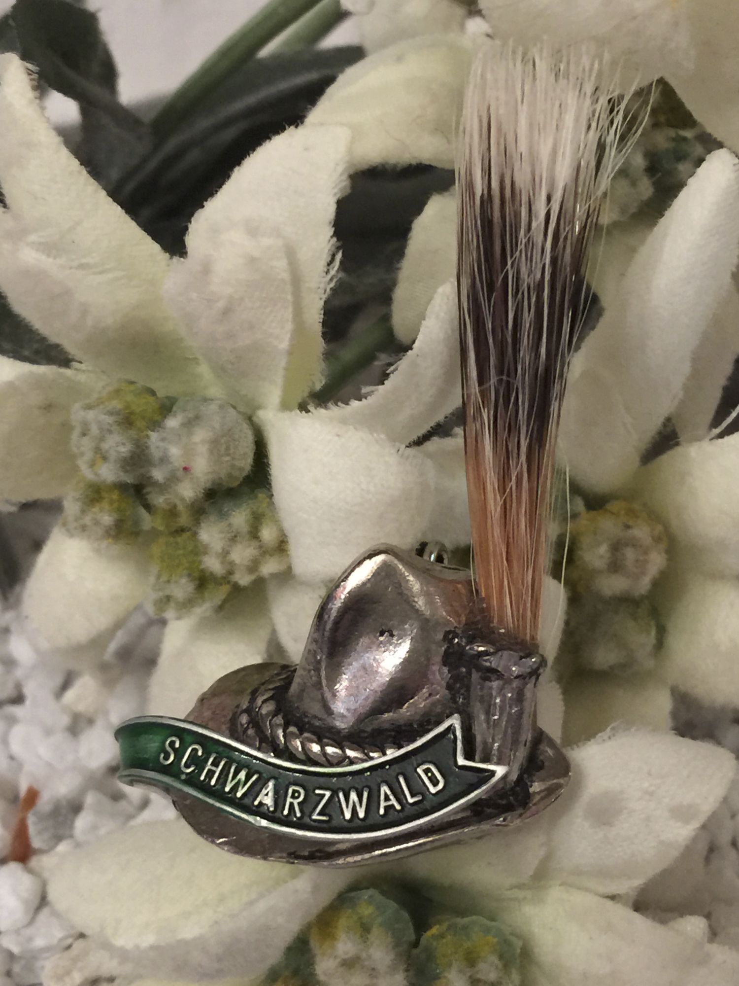 Hier zeigen wir Ihnen eine sehr schöne Hutnadel mit Wanderhut und Gamsbart.
