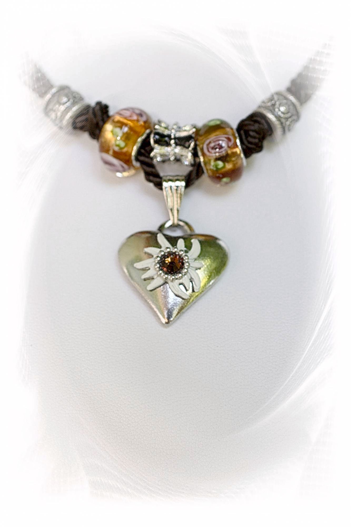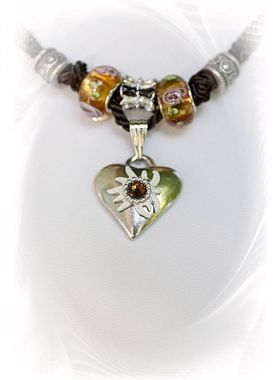 Der Herz-Anhänger mit Edelweiß und funkeldem Strassstein, dazu die farblich perfekt passenden Schmuckornamente und Schmuckperlen.