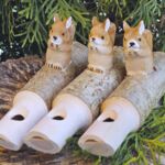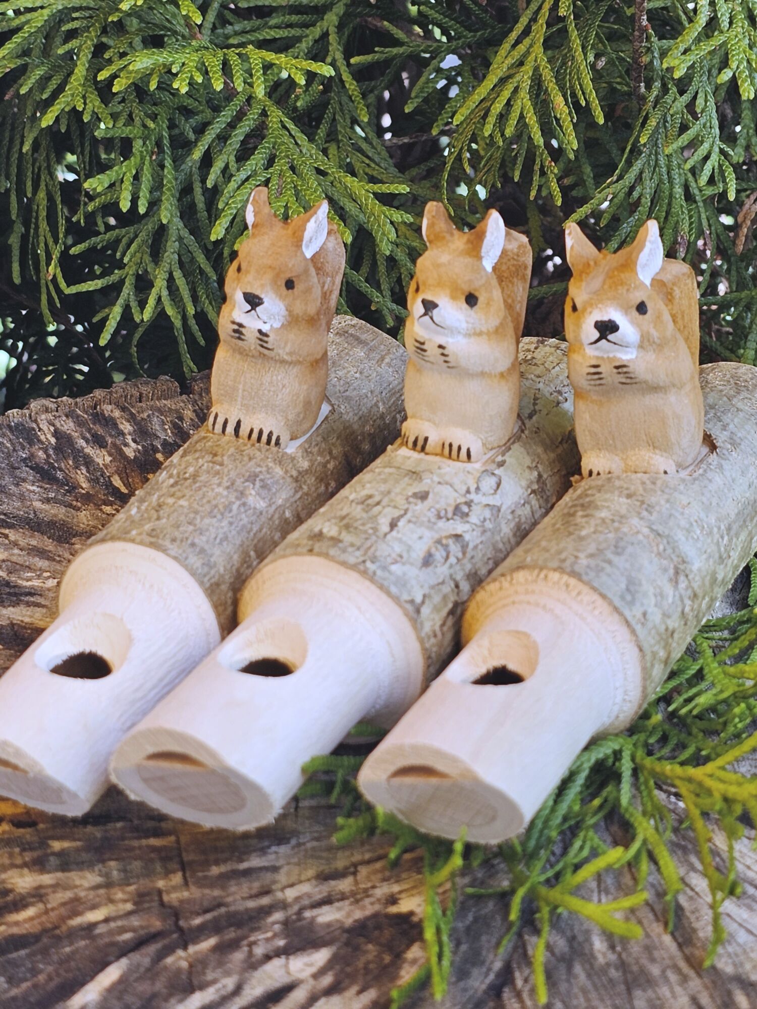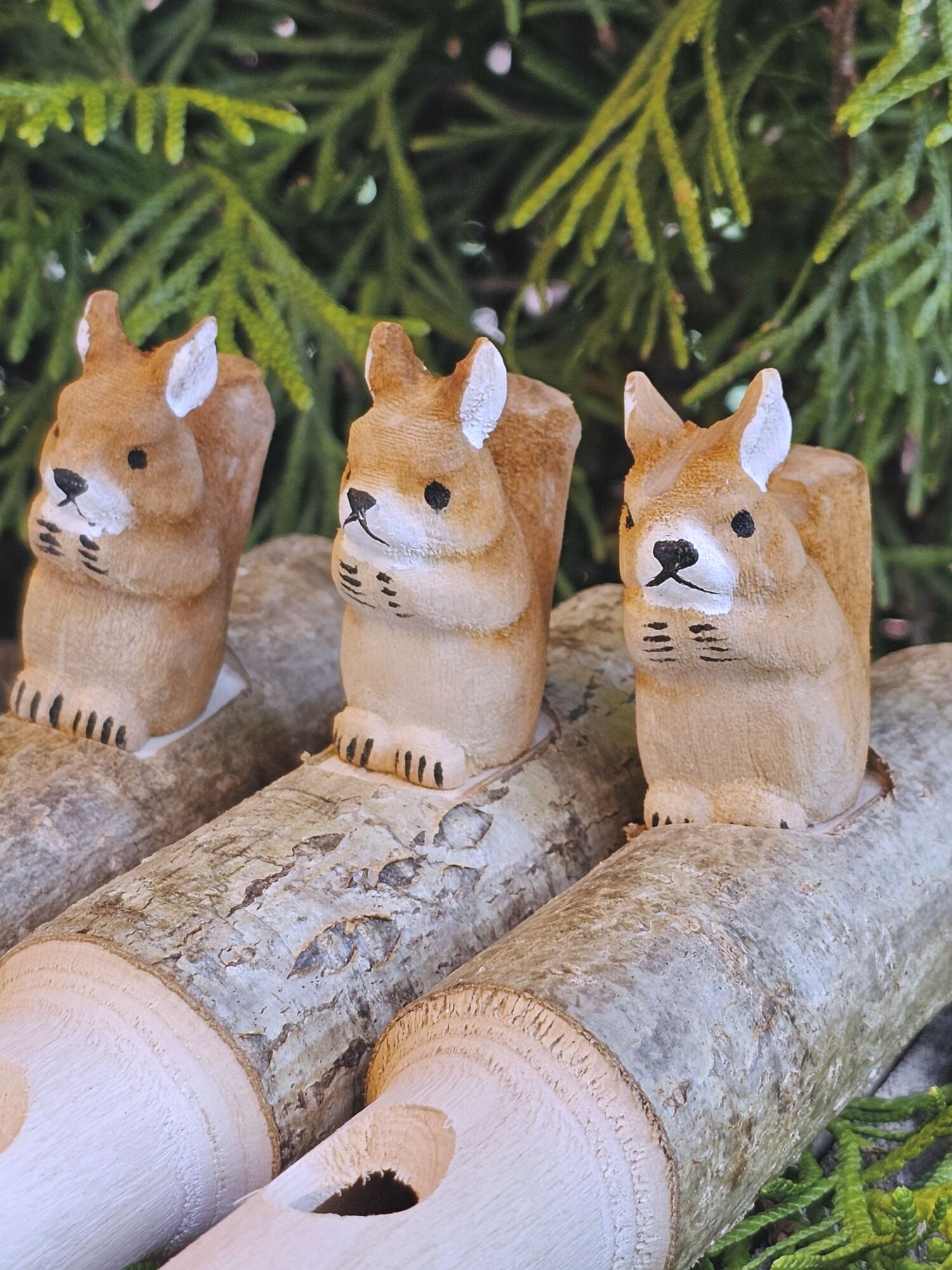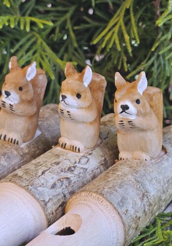 Handgefertigte Kuckuckspfeifen aus echtem Holz gefertigt mit einem ebenfalls handgeschnitztem Eichhörnchen aus Holz.