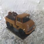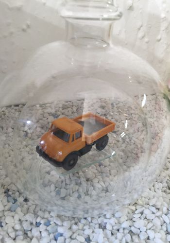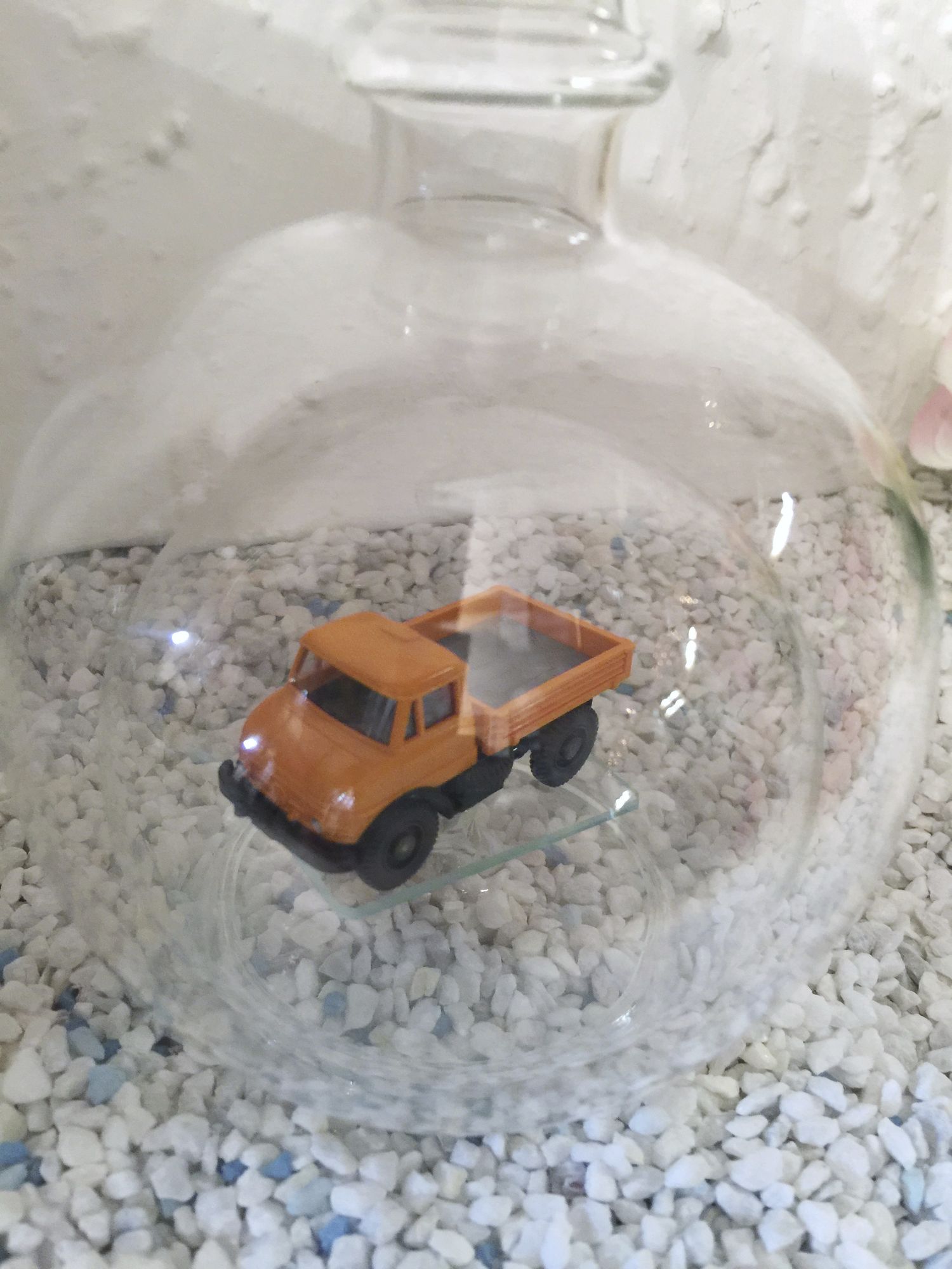 Hier zeigen wir Ihnen eine edle gefertigte, mundgeblasene Glasflasche mit einem Fahrzeug-Modell 1:87 des legendären Unimogs MB 406