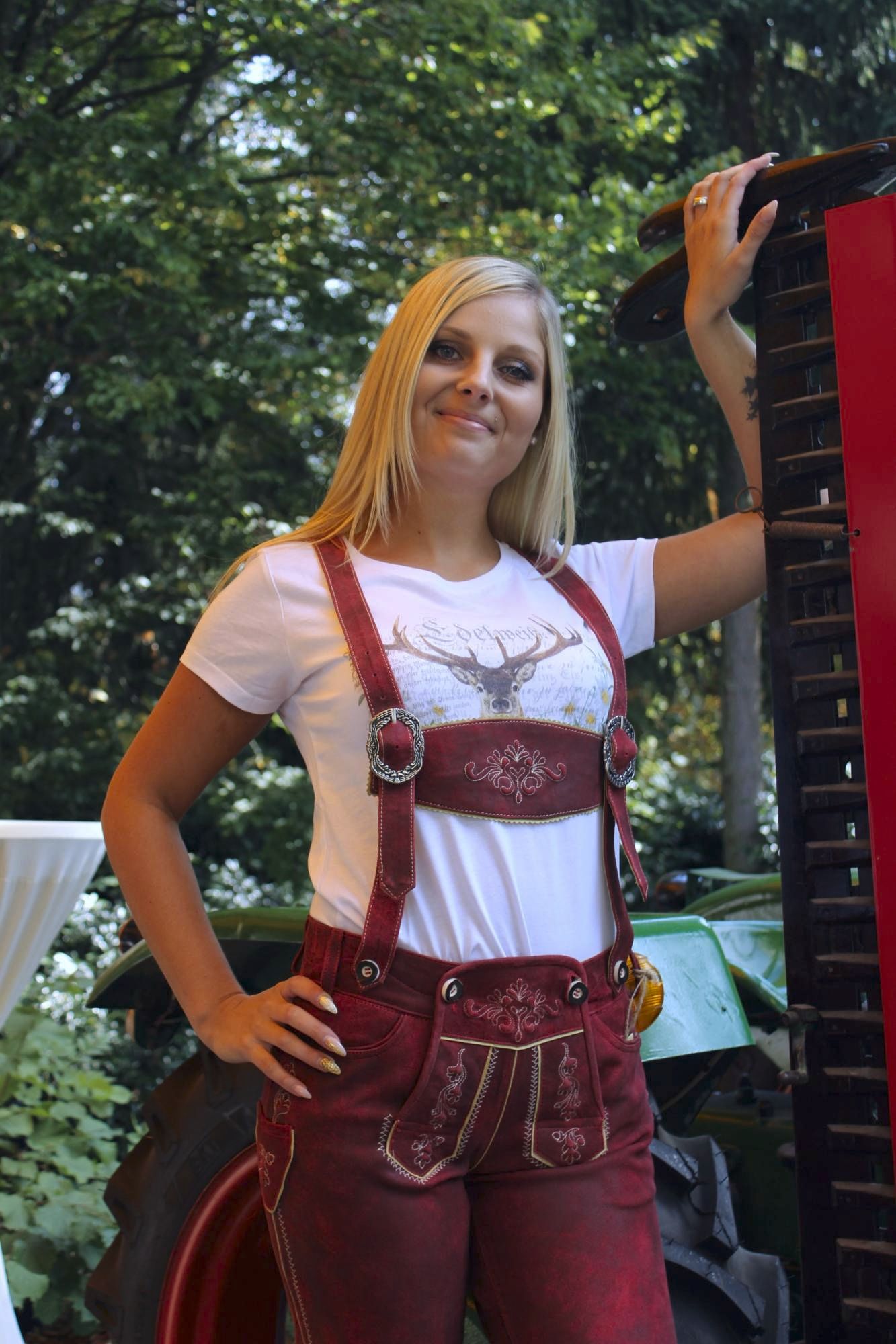 Diese fetzige Lederhose ist in weinrot gefertigt