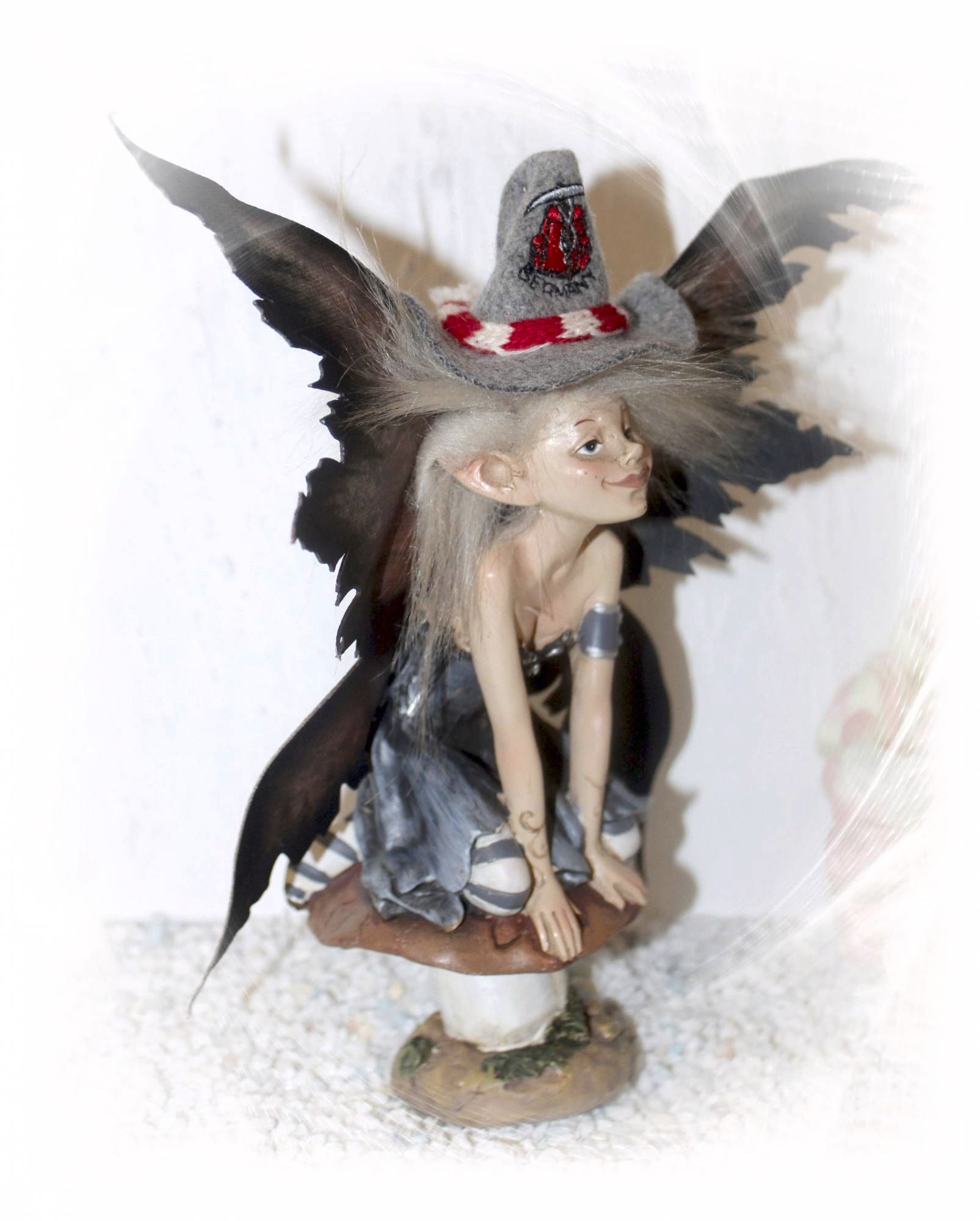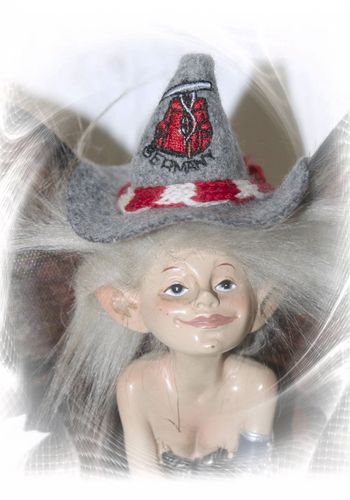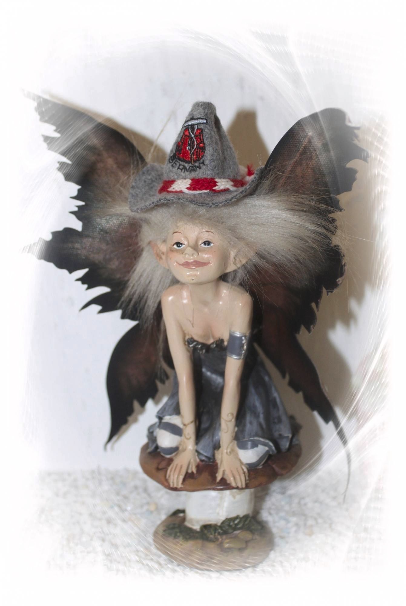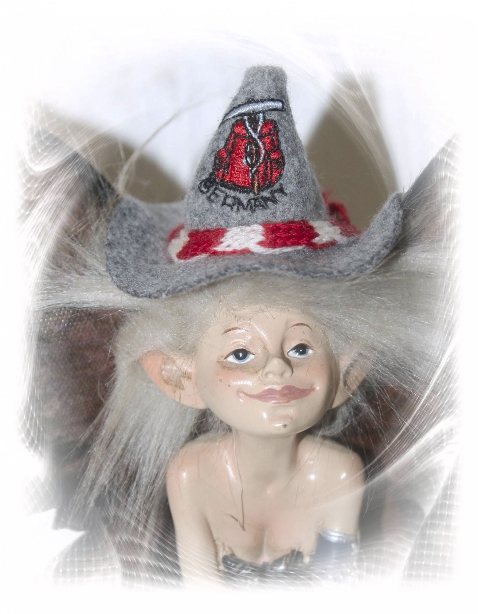 Diese Elfe hat einen hangefertigten Schwarzwälder Spitzhut aus Filz mit gesticktem Motiv