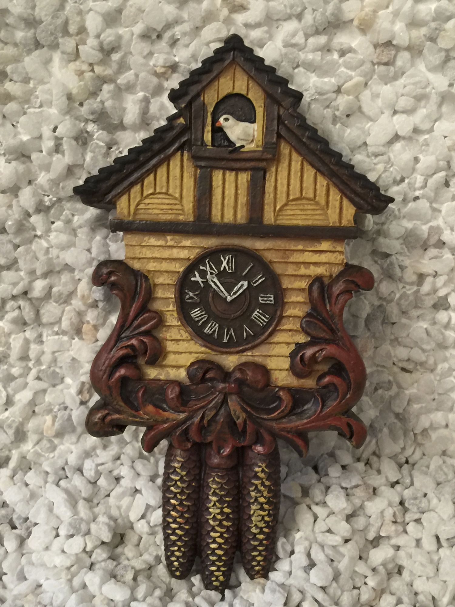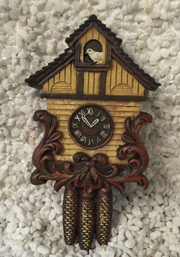 Schön gearbeitete Kuckucksuhr mit Zapfen als Magnet.