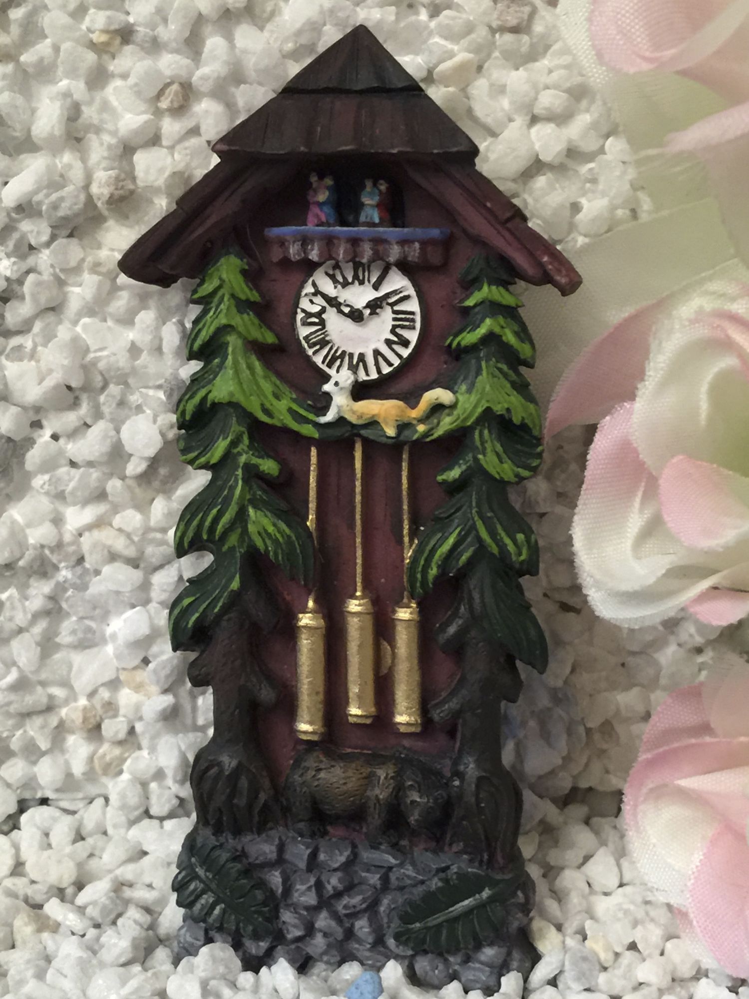 Schön gearbeitete Kuckucksuhr als Standuhr mit Zapfen, Tannen und Schwarzwaldbär als Magnet.