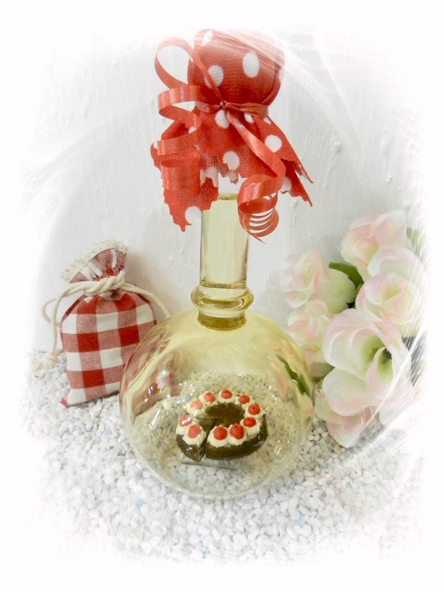 Hier zeigen wir Ihnen eine edle gefertigte Glasflasche mit einer Schwarzwälder Kirschtorte.