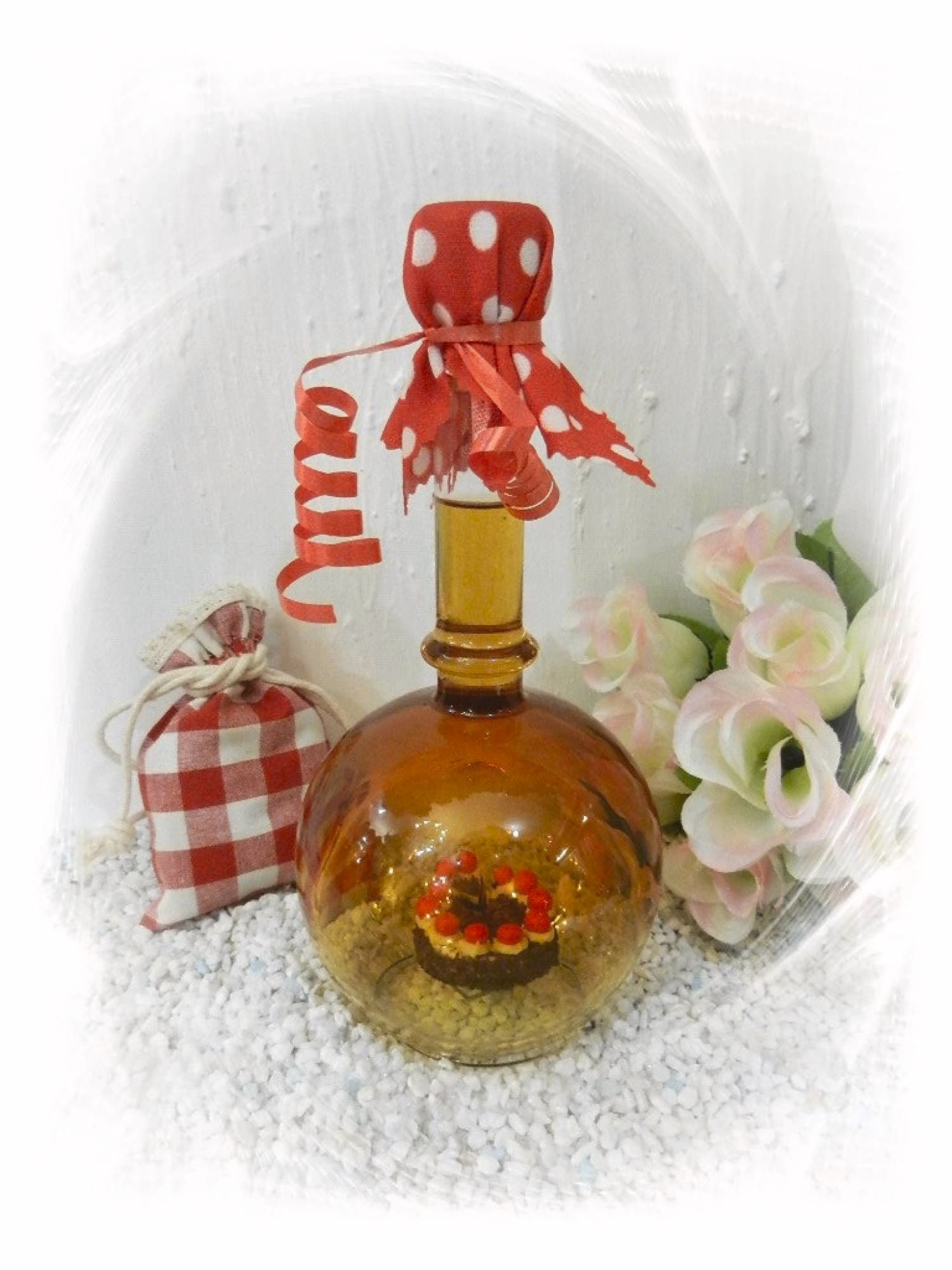 Hier zeigen wir Ihnen eine edle gefertigte Glasflasche mit mit einer Schwarzwälder Kirschtorte.