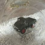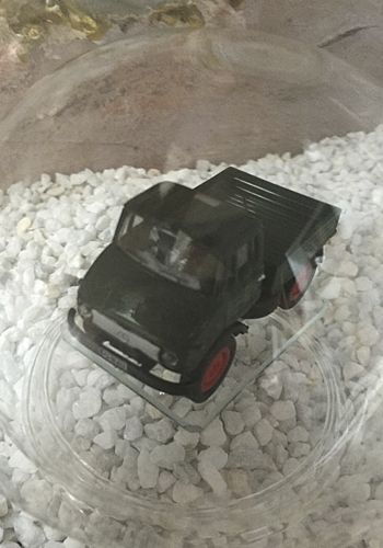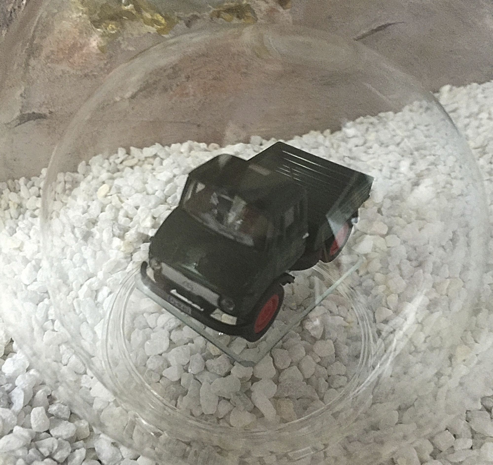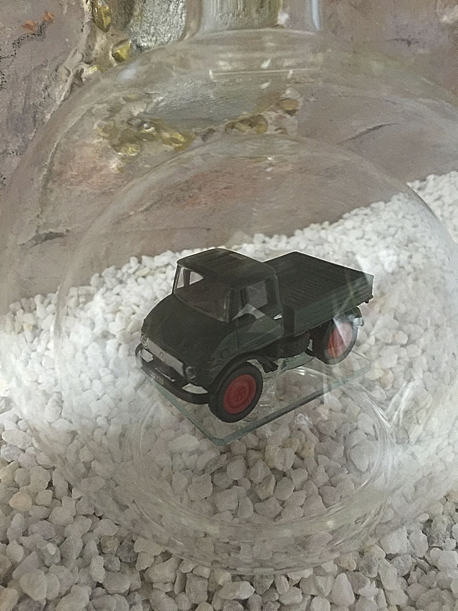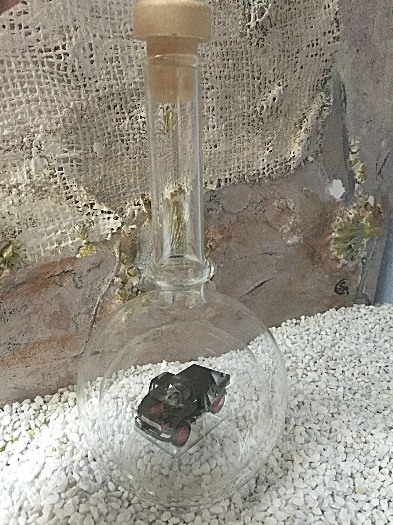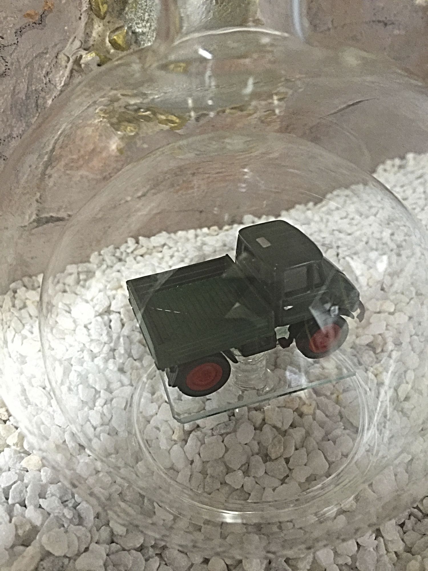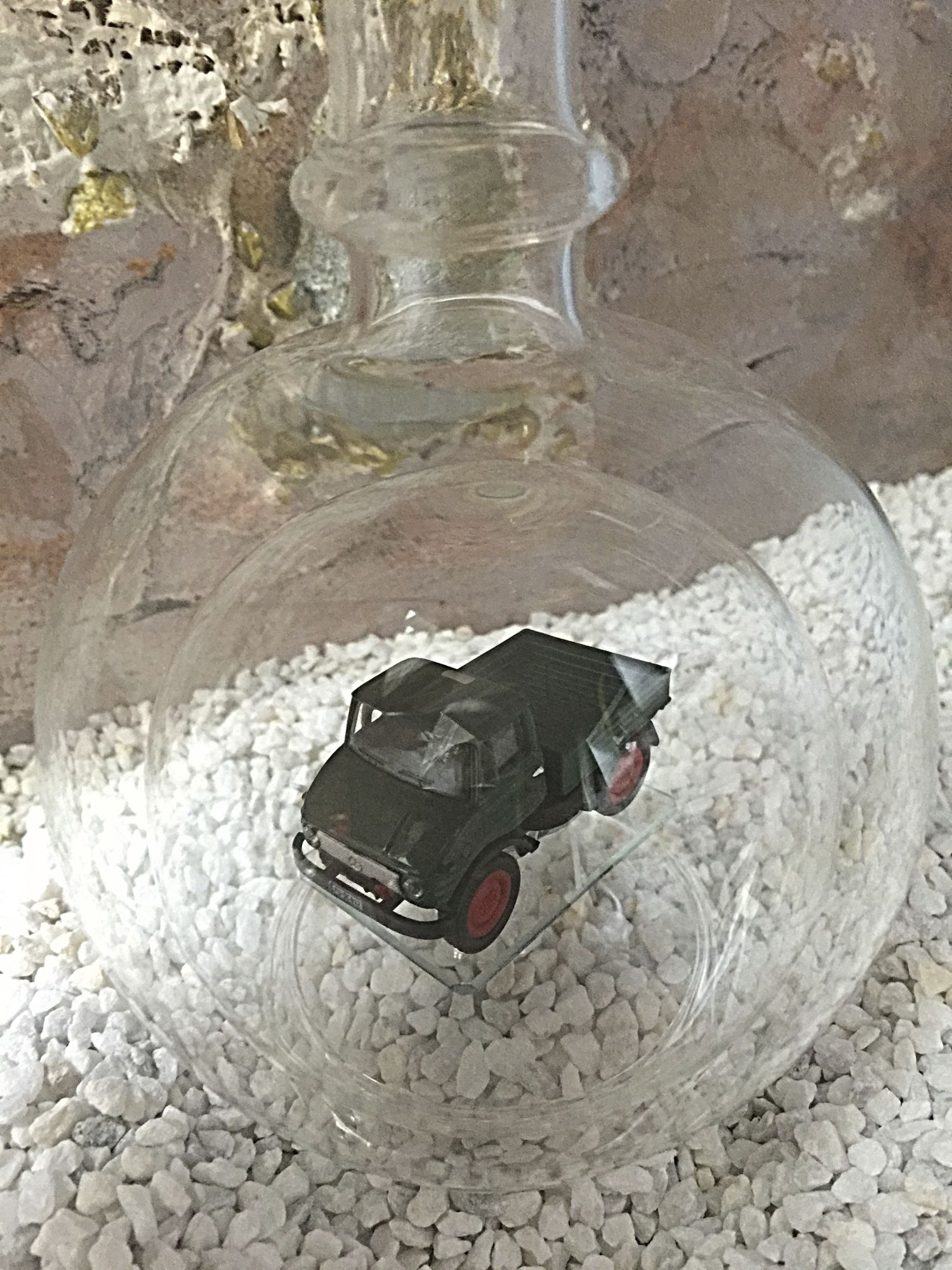 Hier zeigen wir Ihnen eine edle gefertigte, mundgeblasene Glasflasche mit einem Fahrzeug-Modell 1:87 des legendären Unimogs MB 406