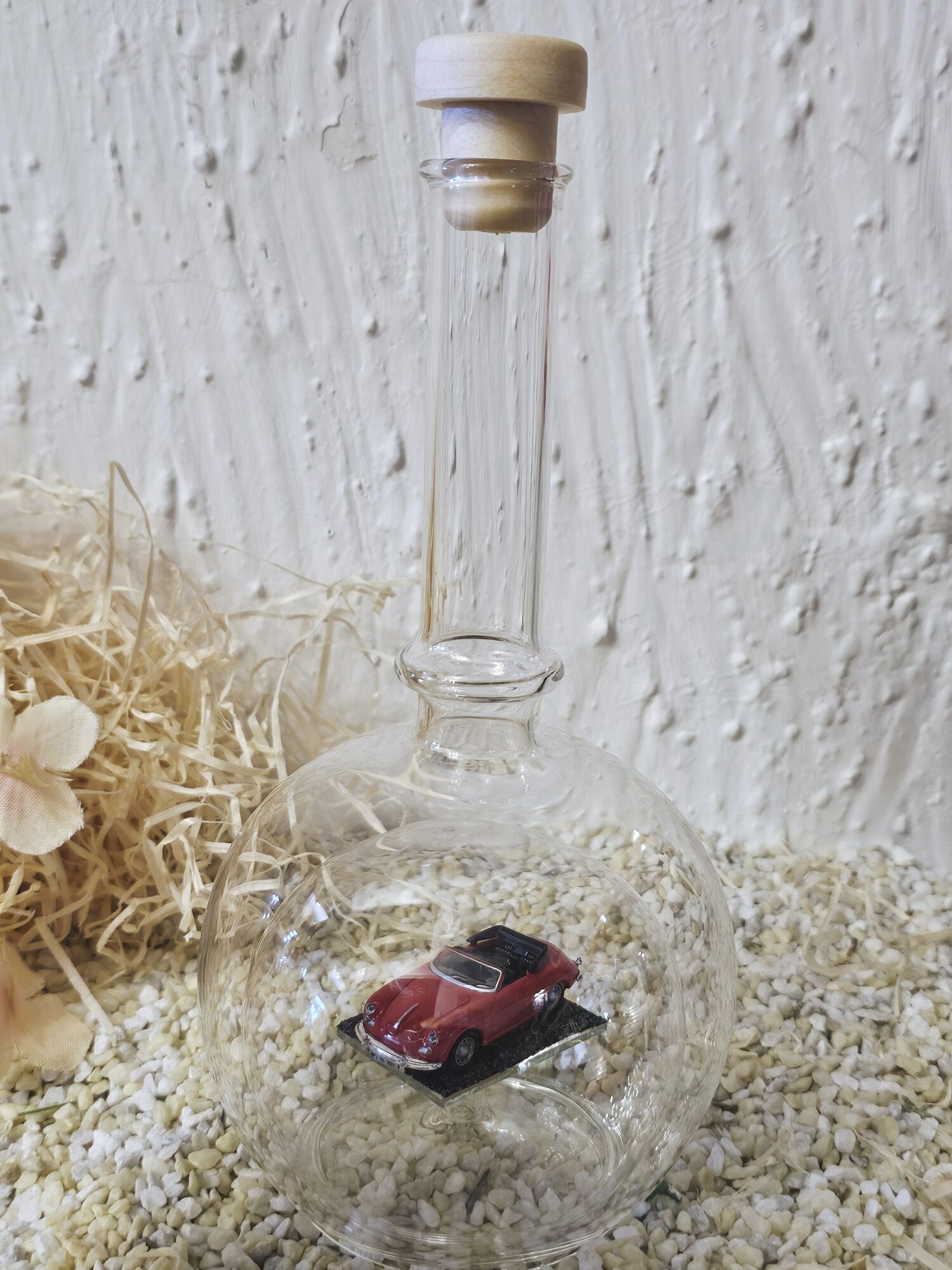 Hier zeigen wir Ihnen eine edle gefertigte, mundgeblasene Glasflasche mit einem Fahrzeug-Modell 1:87 Porsche 356 Cabrio