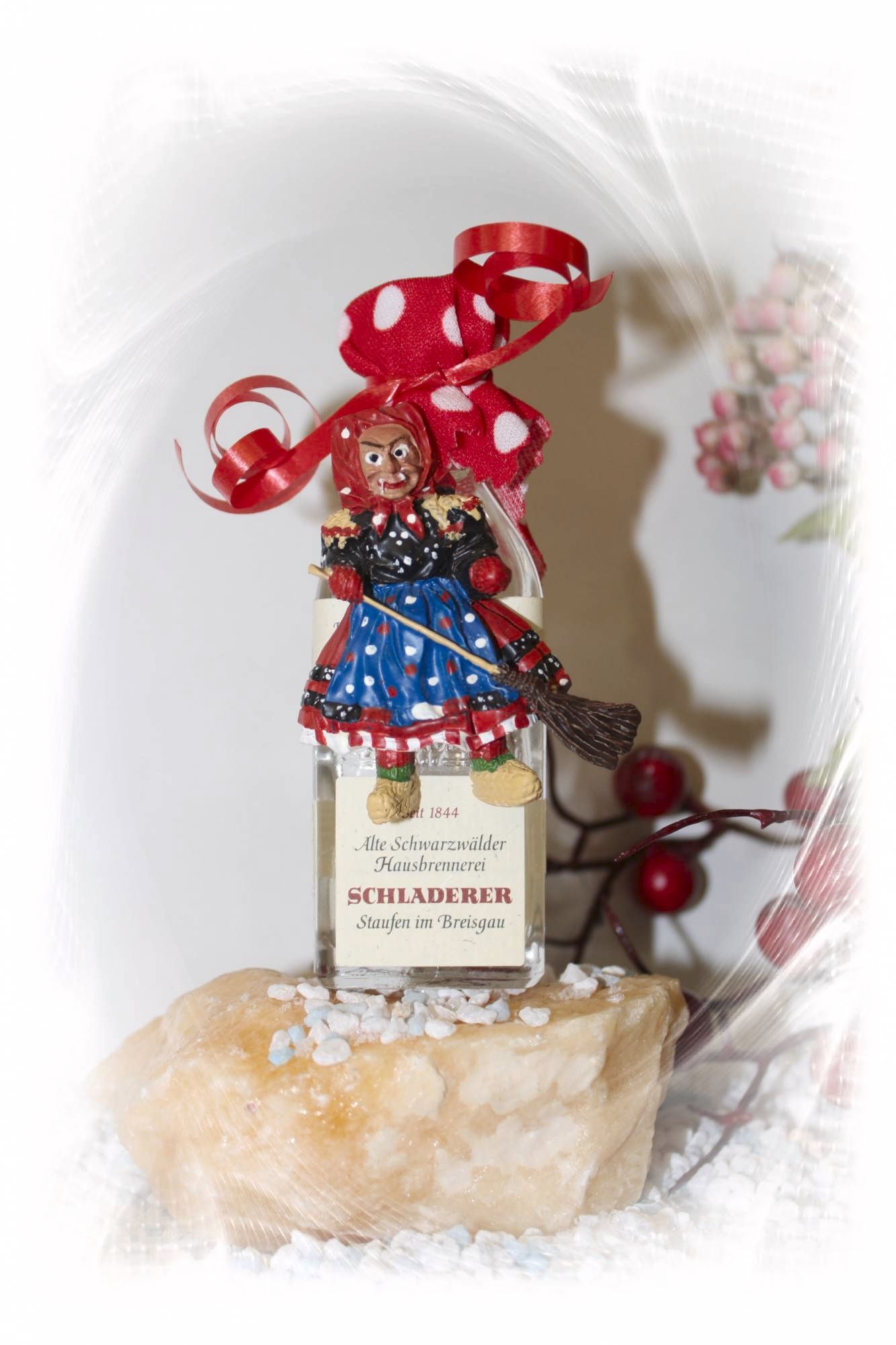 Hier bieten wir Ihnen eine schöne Miniaturflasche aus der Schwarzwaldbrennerei Schladerer mit einer Miniatur Schwarzwald-Hexe an.