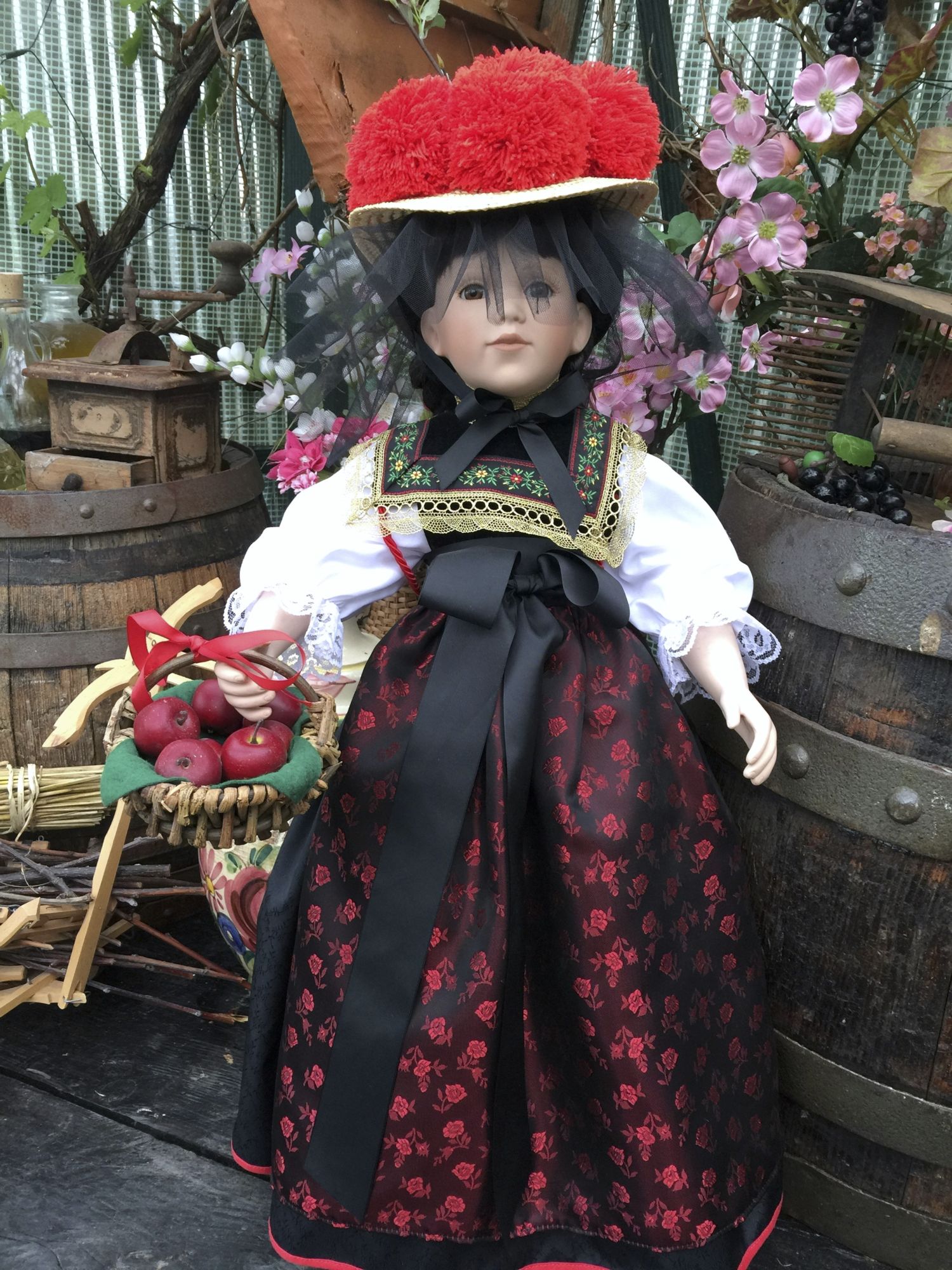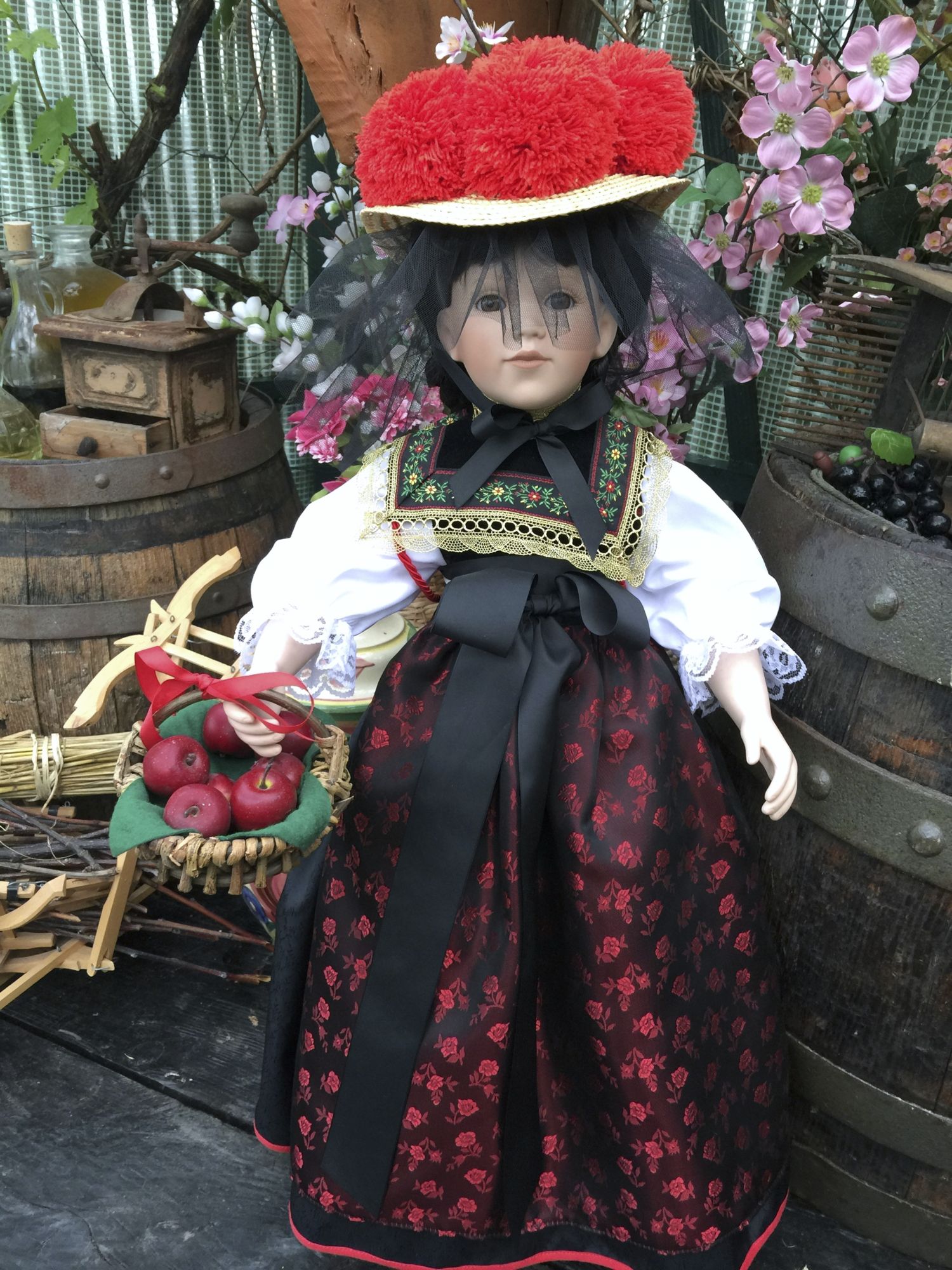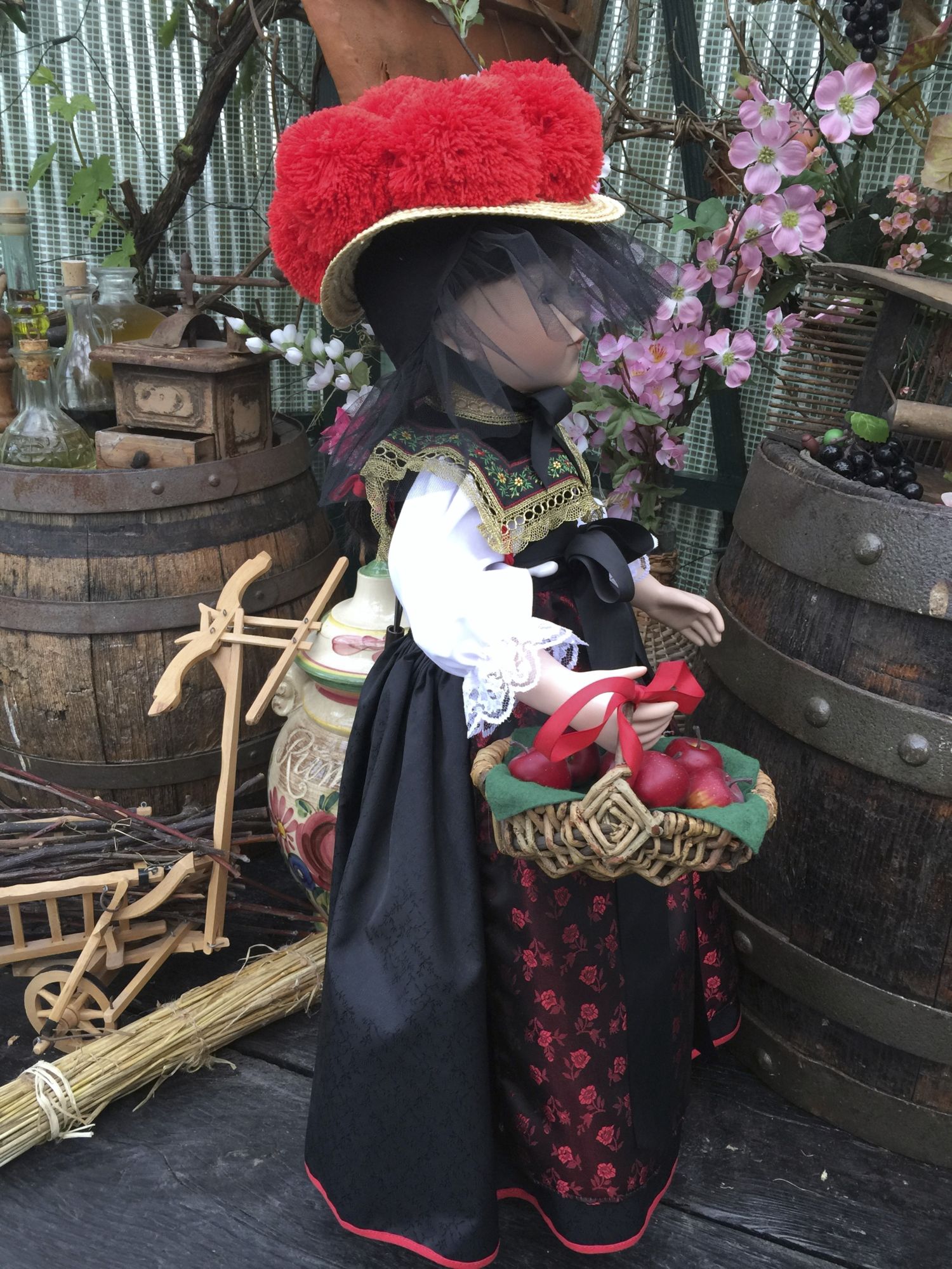 Der rote Bollenhut und der gefüllte Weidenkorb mit Äpfel geben dieser Puppe natürlich den schwarzwälder Liebreiz