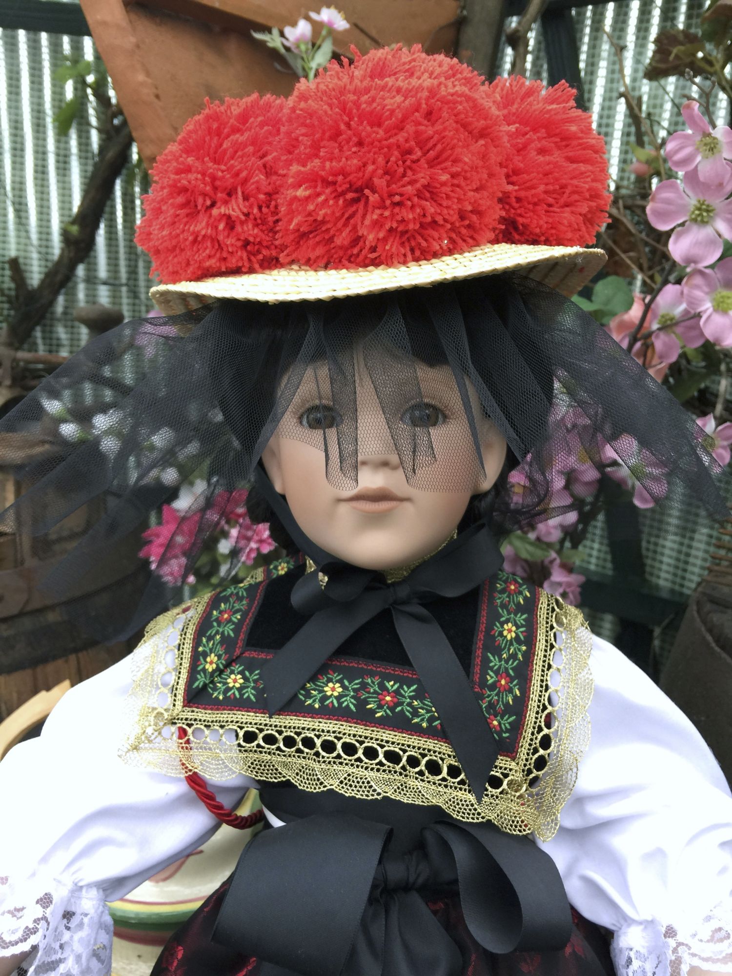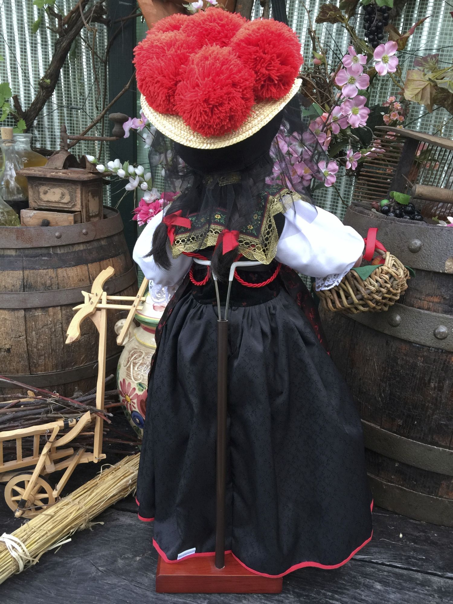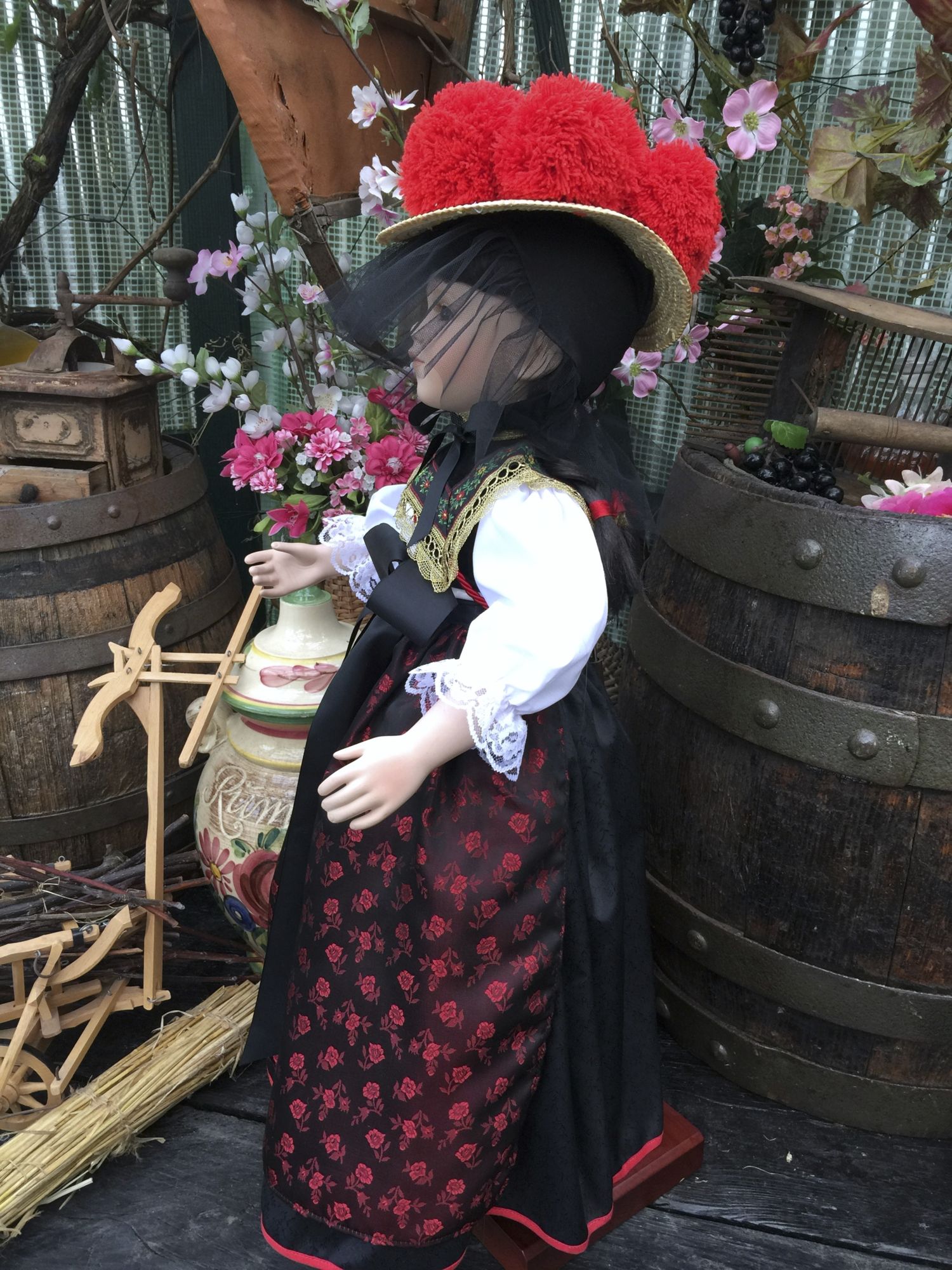 Die Schwarzwaldpuppe trägt eine Schwarzwaldtracht mit dem berühmten roten Schwarzwälder Bollenhut