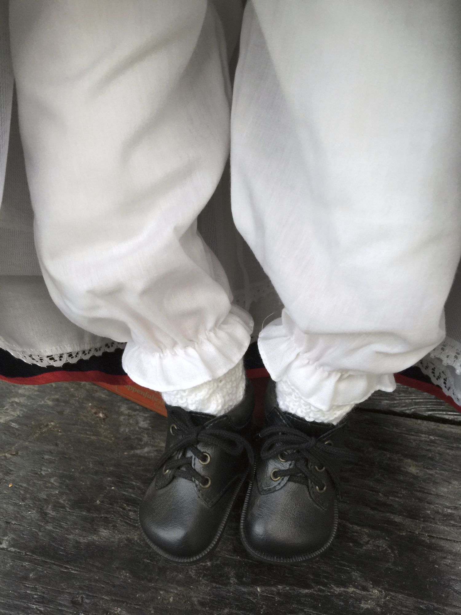 Das Schwarzwaldmädel hat eine Schwarzwaldtracht, die Kleider im Schwarzwaldstiel gehalten, die Schürze mit dem berühmten Rosenmuster, Unterkleid, Unterrock sowie die weiße Trachtenunterhose geben dieser Puppe die Perfektion.
