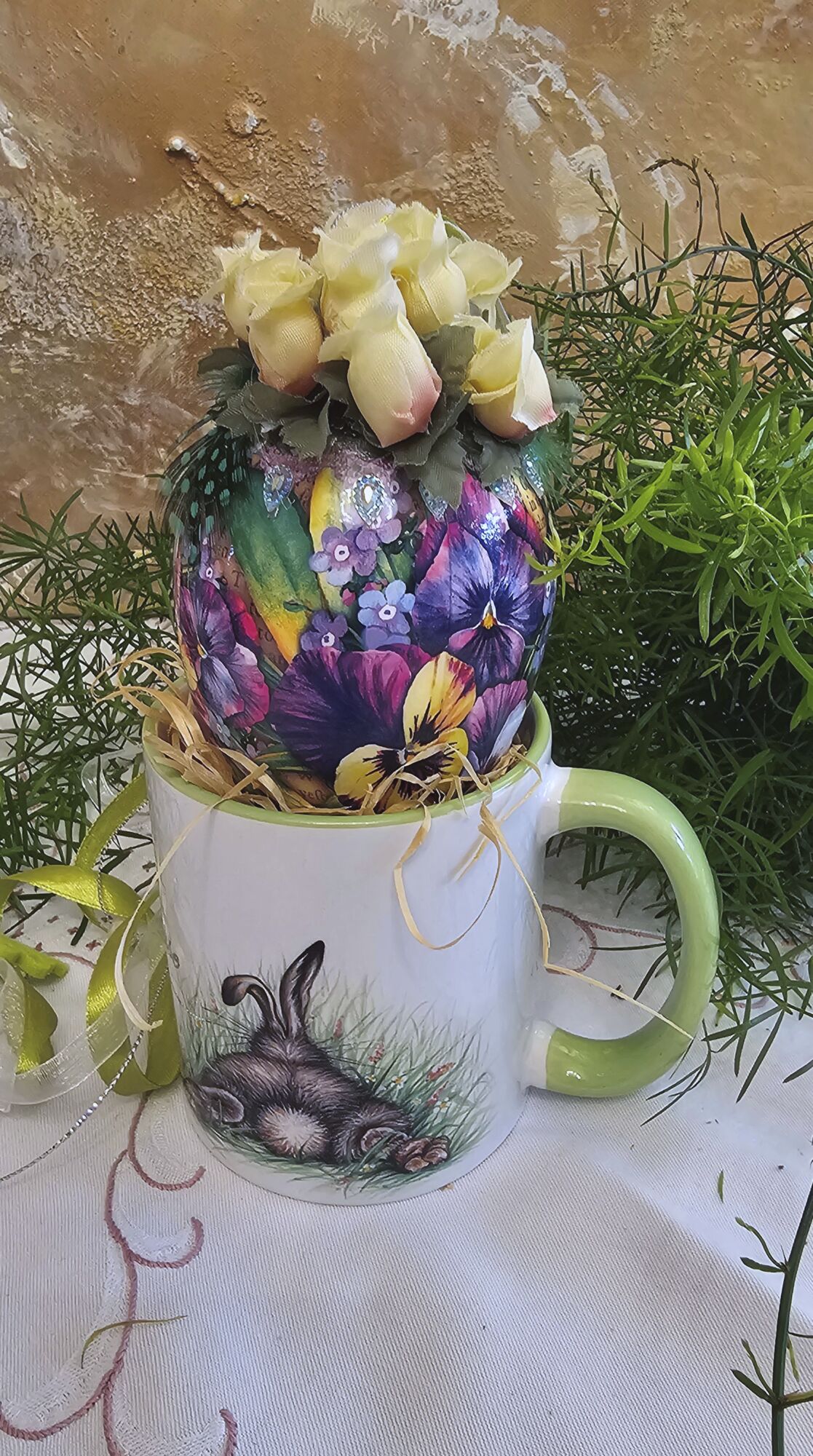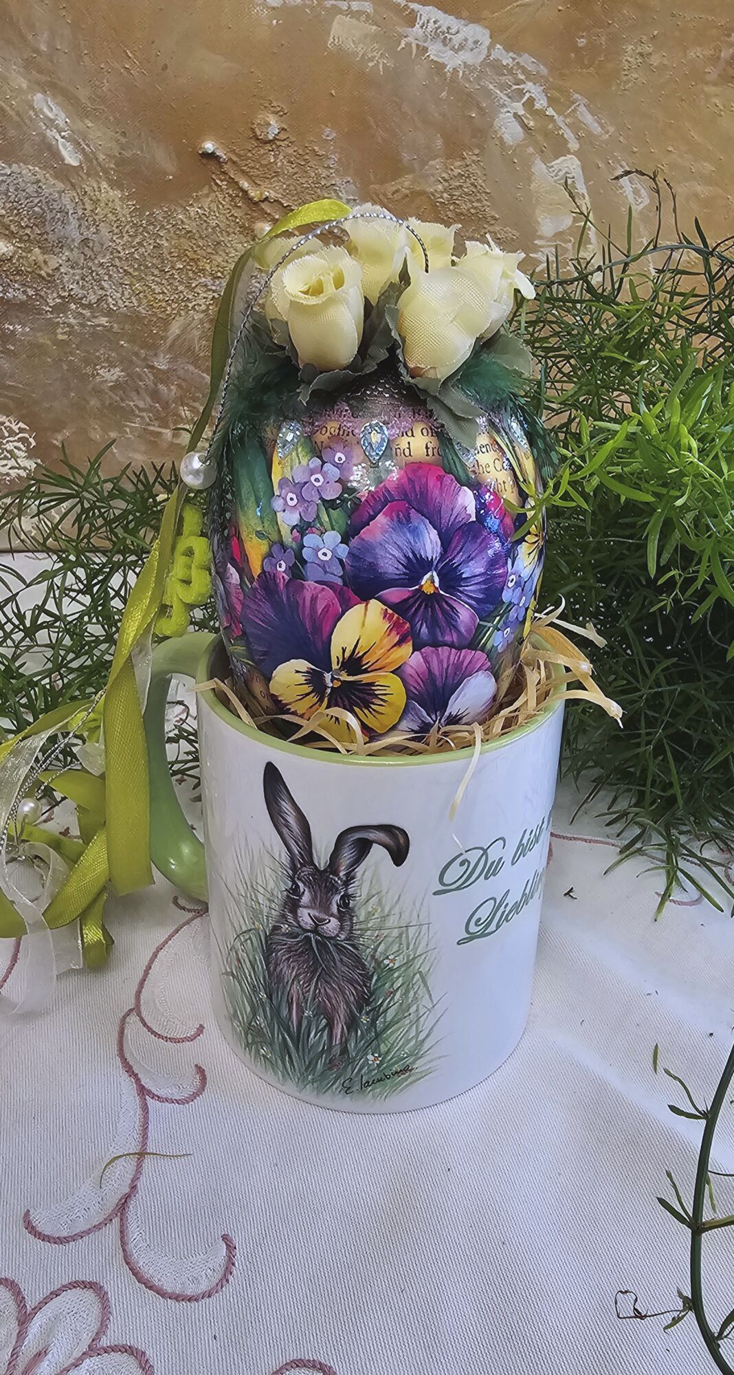 OST1005 Hasentasse mit edlem Deko-Osterei blautöne