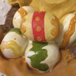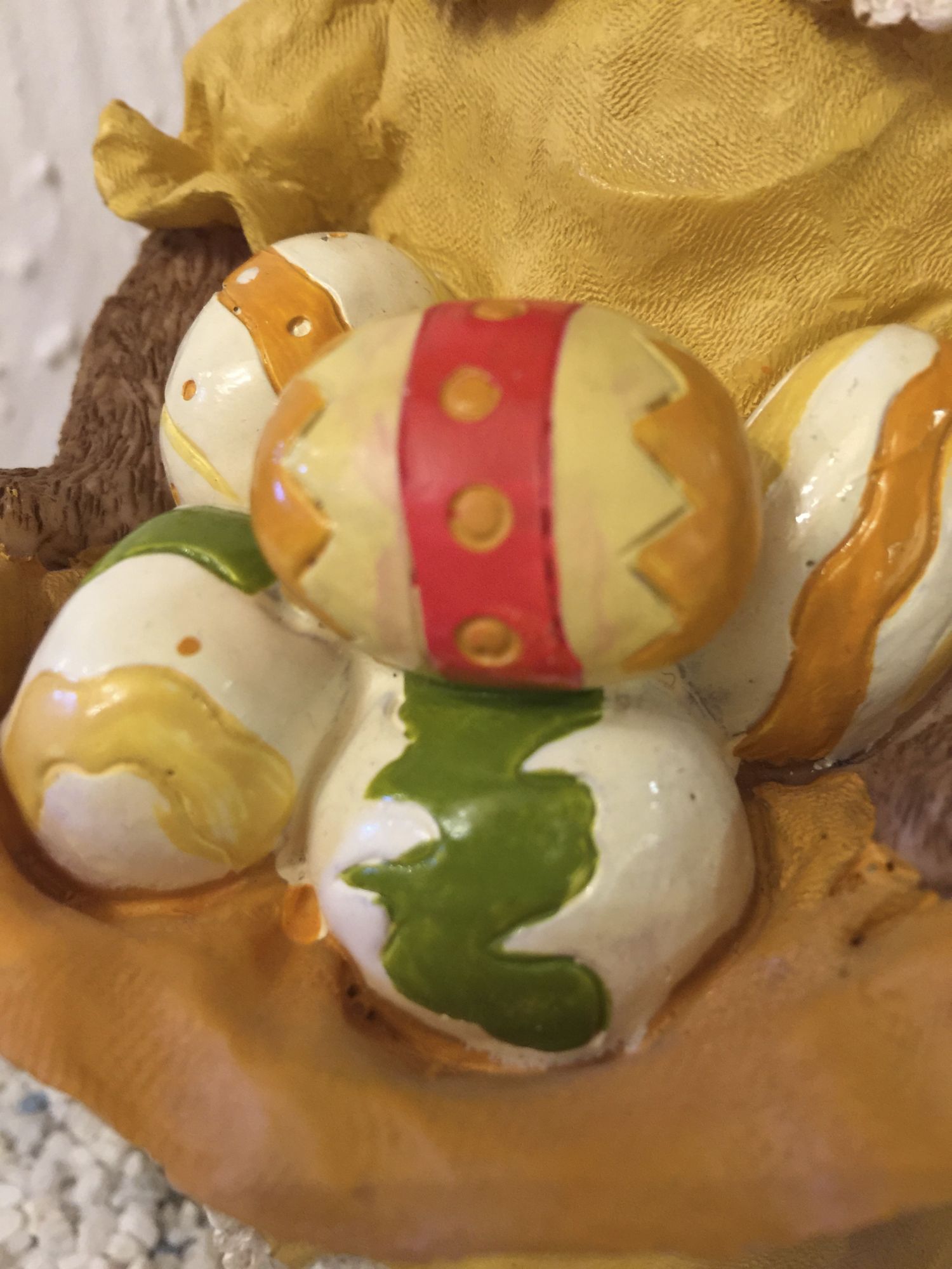 Der liebevoll gestaltete und handbemalte Hase bringt gerade buntgemalte Ostereier.