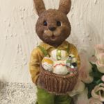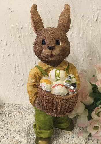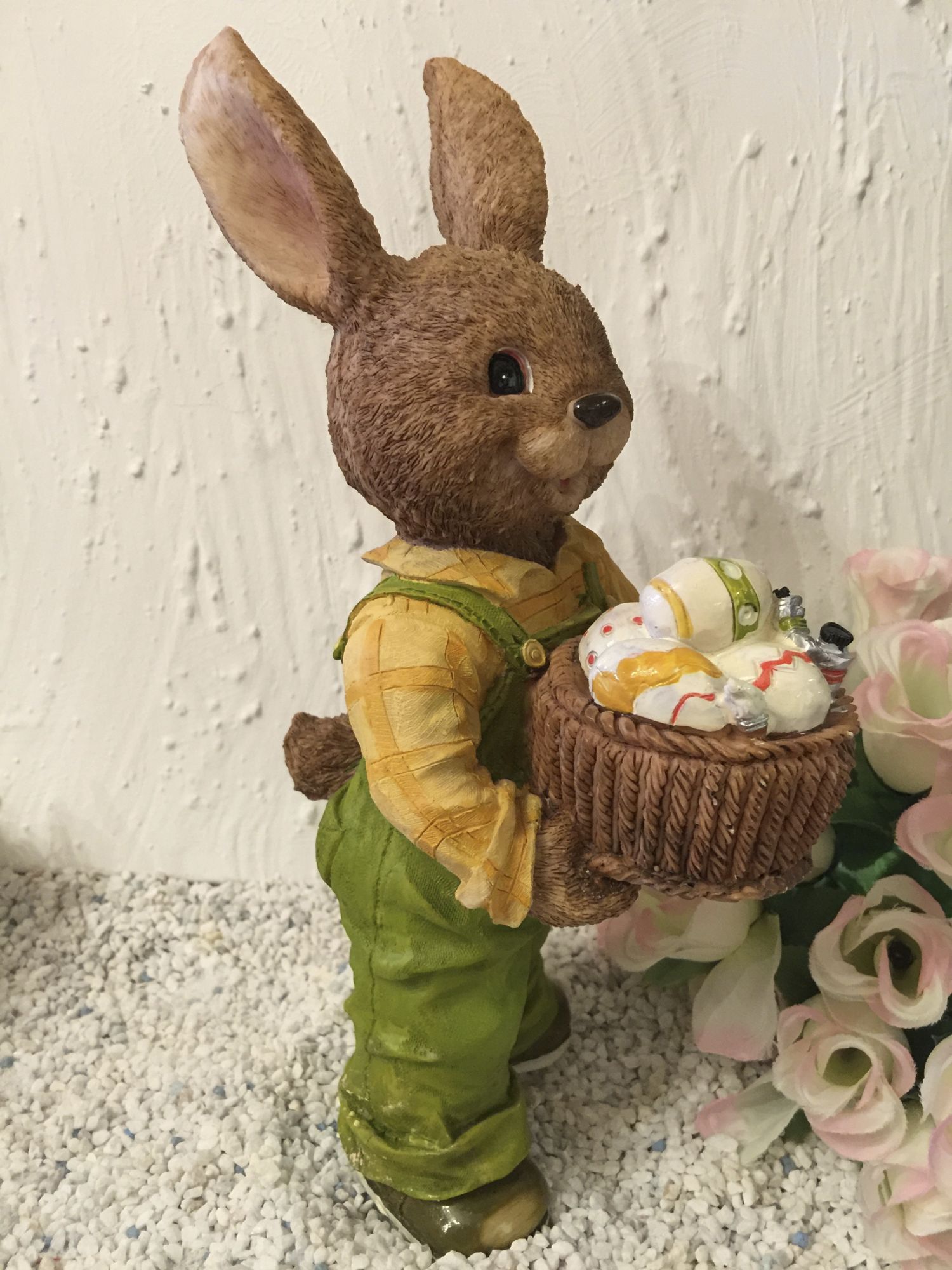Der liebevoll gestaltete und handbemalte Hase bringt gerade buntgemalte Ostereier.