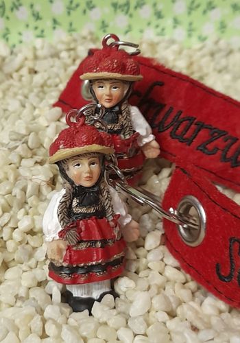 Ein schöner Schlüsselanhänger mit Schwarzwaldmädel und einem Filzband mit der Aufschrift: Schwarzwald