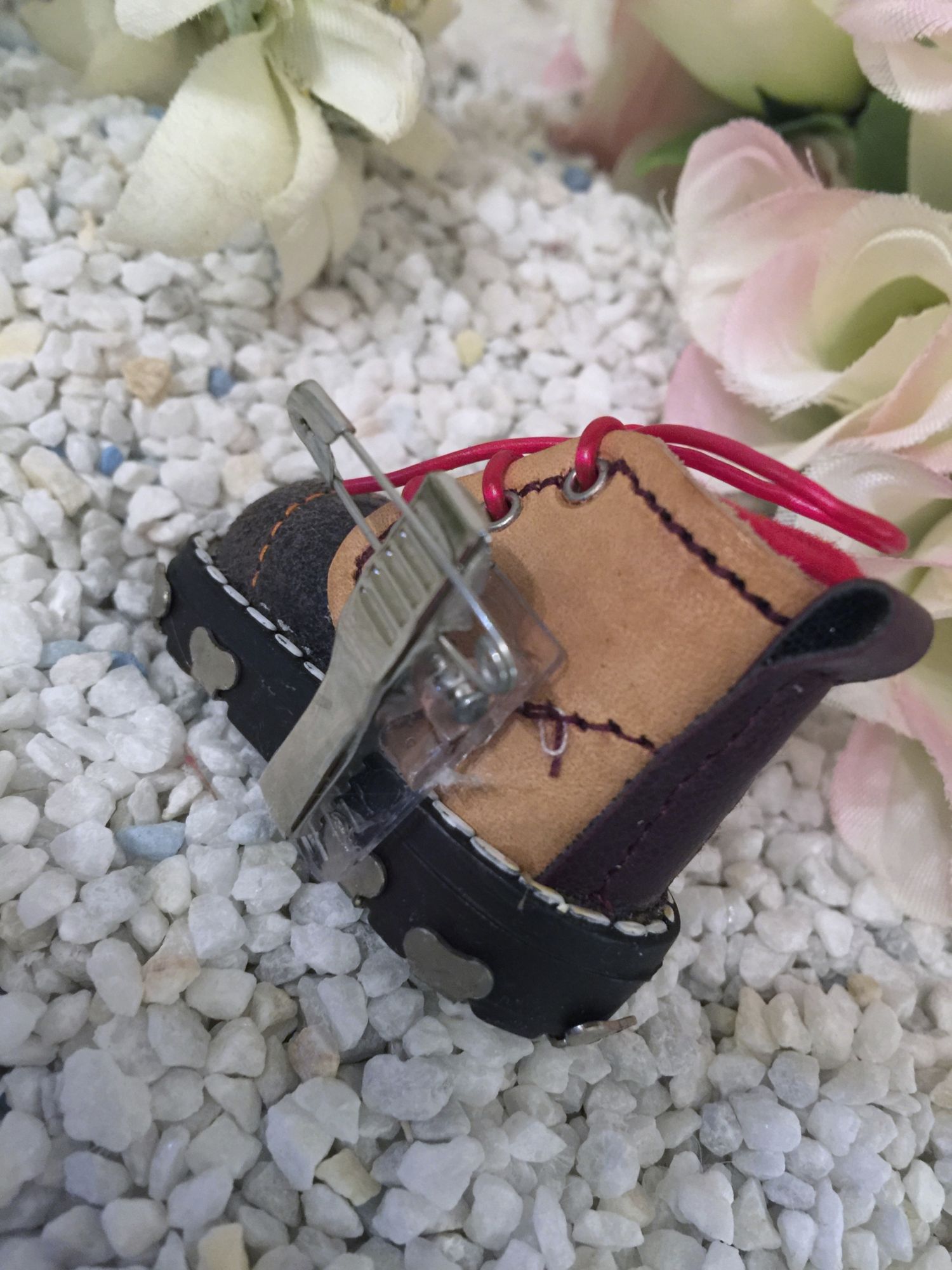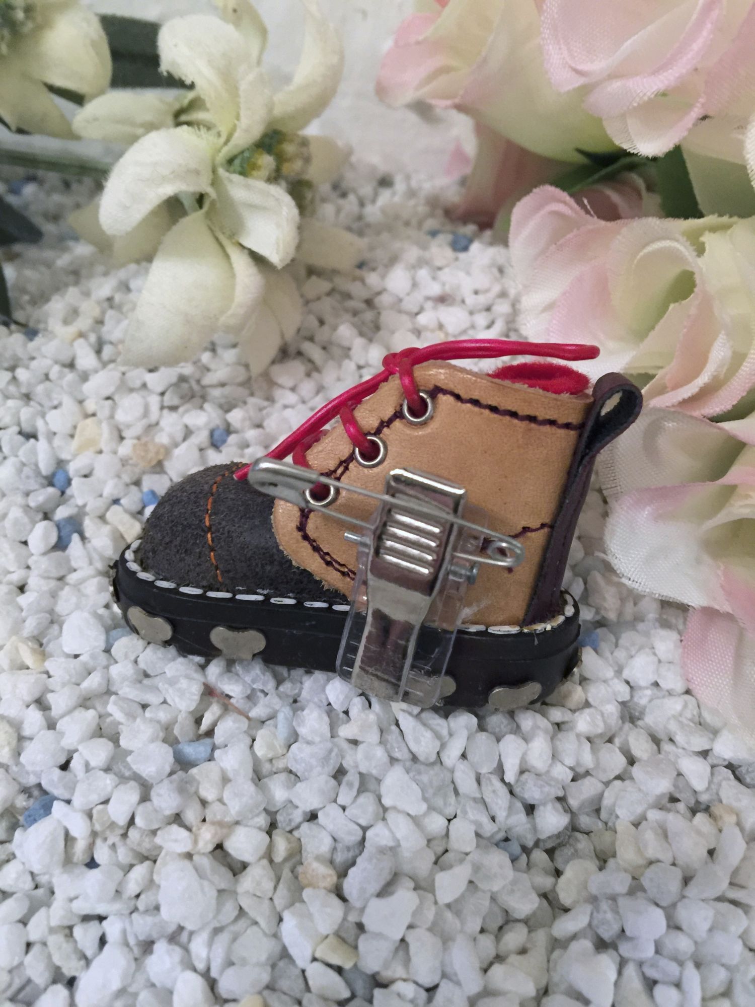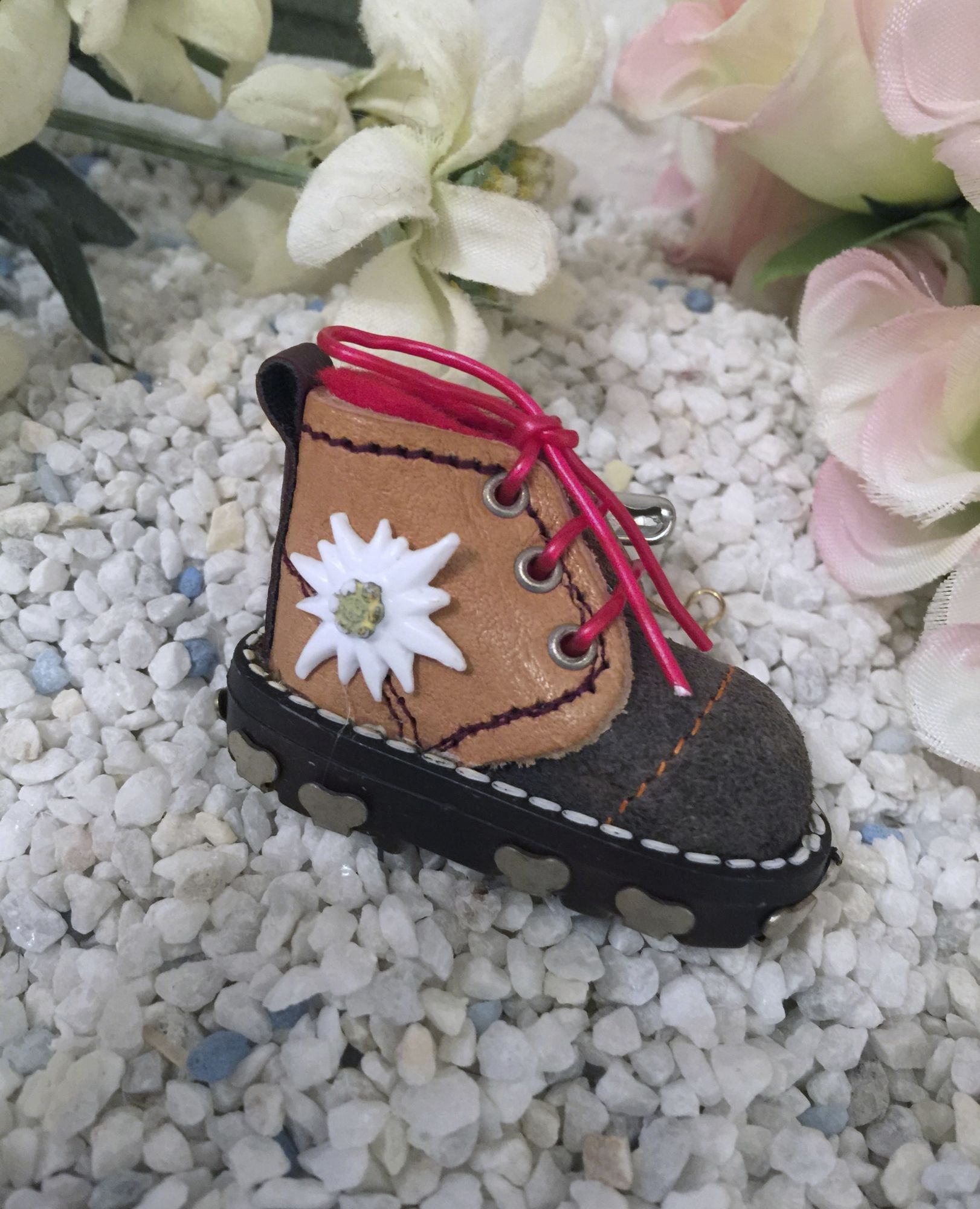 Geschnürt,wie ein echter Schuh mit Ansteckklammer und Nadel, so ist der Schuh sehr vielseitig verwendbar.