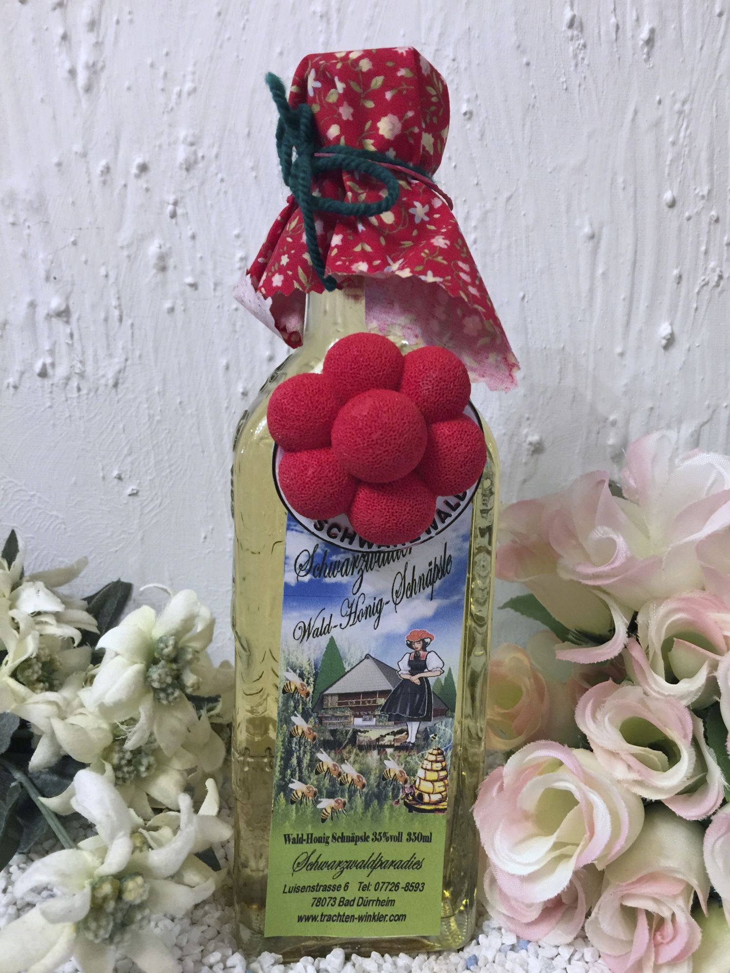 Für uns abgefüllt in der schönen Schwarzwaldflasche mit SchwarzwaldmotivenDas Honigfläschle wird von uns geschmückt mit einem Tüchlein und schönem Schwarzwälder Figurenmotiv.