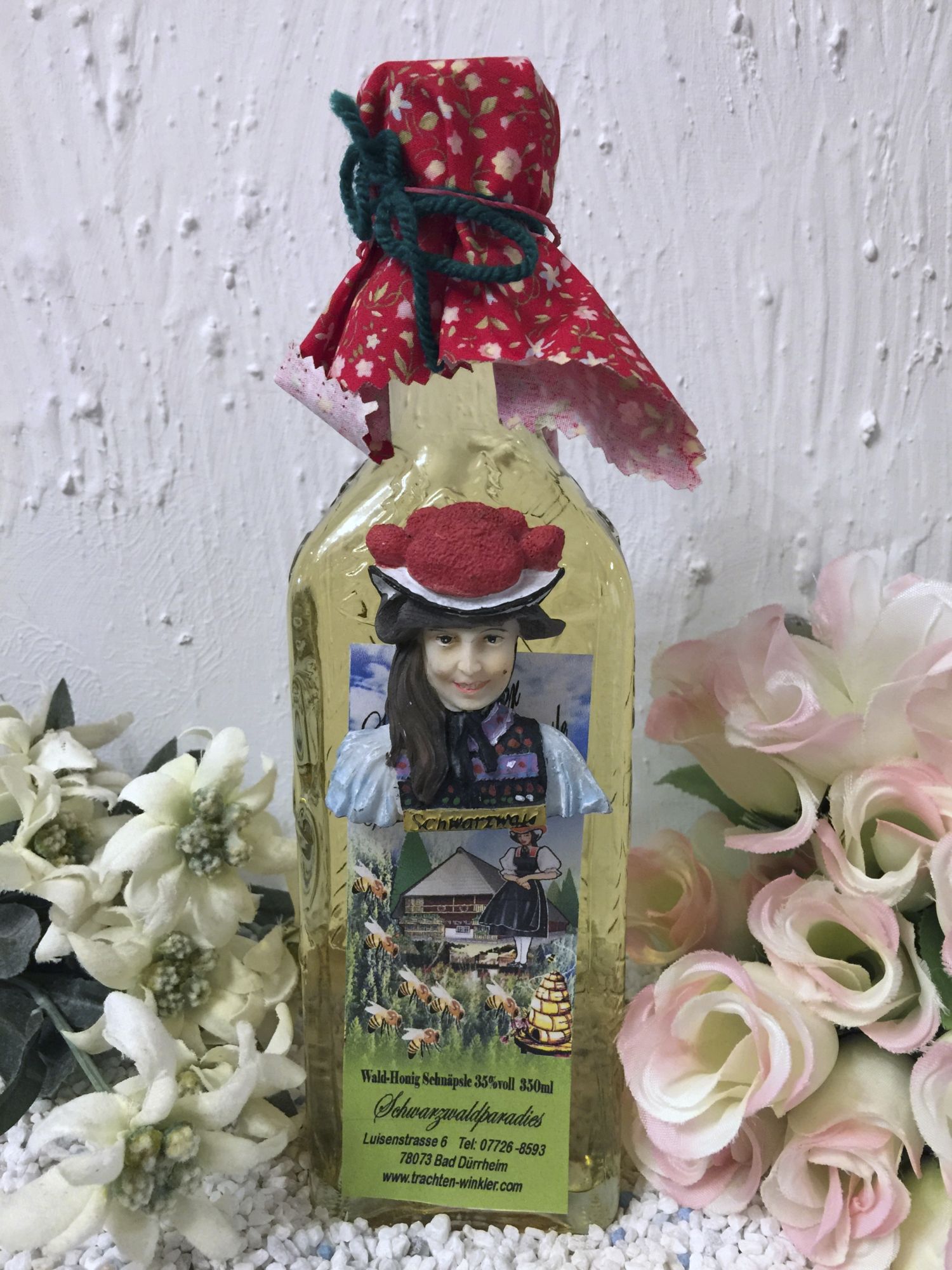 Für uns abgefüllt in der schönen Schwarzwaldflasche mit SchwarzwaldmotivenDas Honigfläschle wird von uns geschmückt mit einem Tüchlein und schönem Schwarzwälder Figurenmotiv.