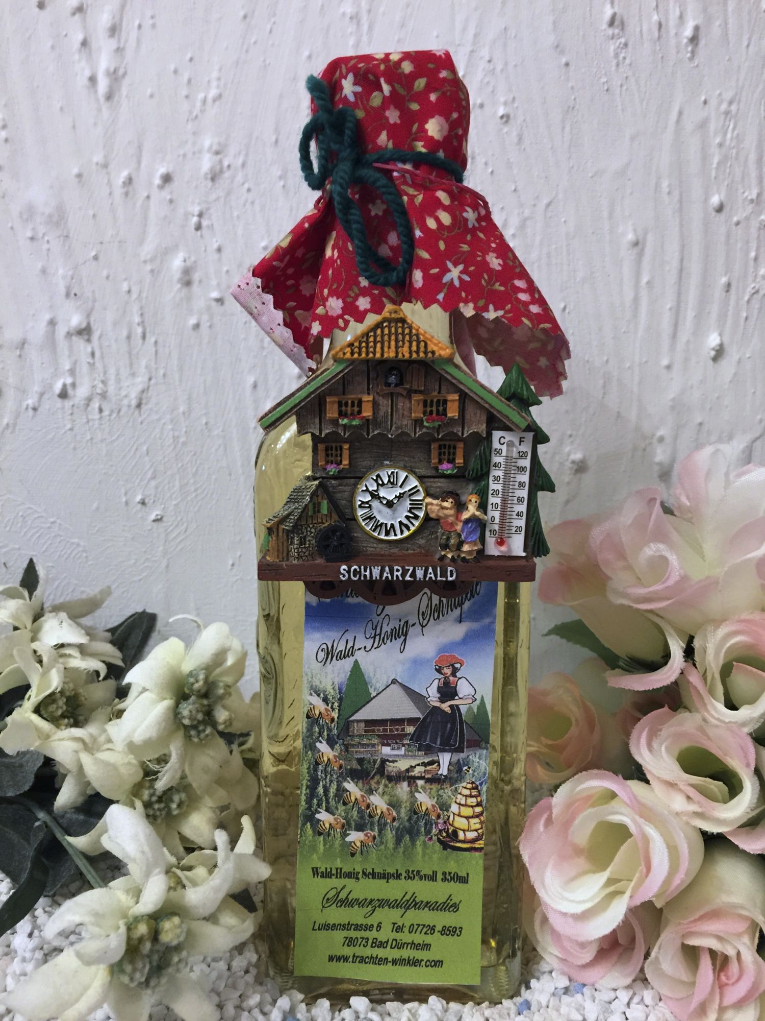 Für uns abgefüllt in der schönen Schwarzwaldflasche mit SchwarzwaldmotivenDas Honigfläschle wird von uns geschmückt mit einem Tüchlein und schönem Schwarzwälder Figurenmotiv.