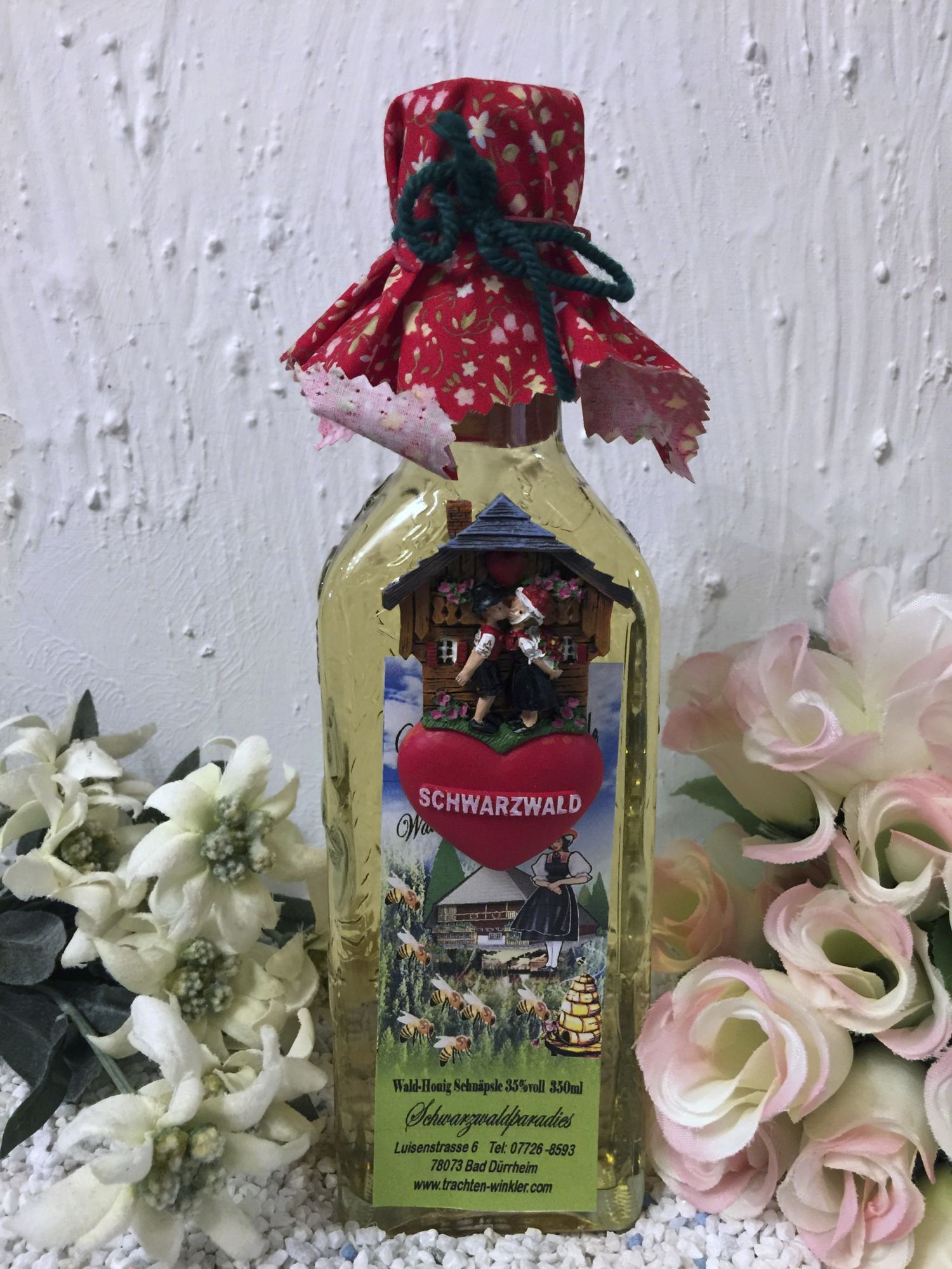 Für uns abgefüllt in der schönen Schwarzwaldflasche mit SchwarzwaldmotivenDas Honigfläschle wird von uns geschmückt mit einem Tüchlein und schönem Schwarzwälder Figurenmotiv.
