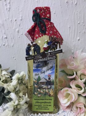 Für uns abgefüllt in der schönen Schwarzwaldflasche mit SchwarzwaldmotivenDas Honigfläschle wird von uns geschmückt mit einem Tüchlein und schönem Schwarzwälder Figurenmotiv.