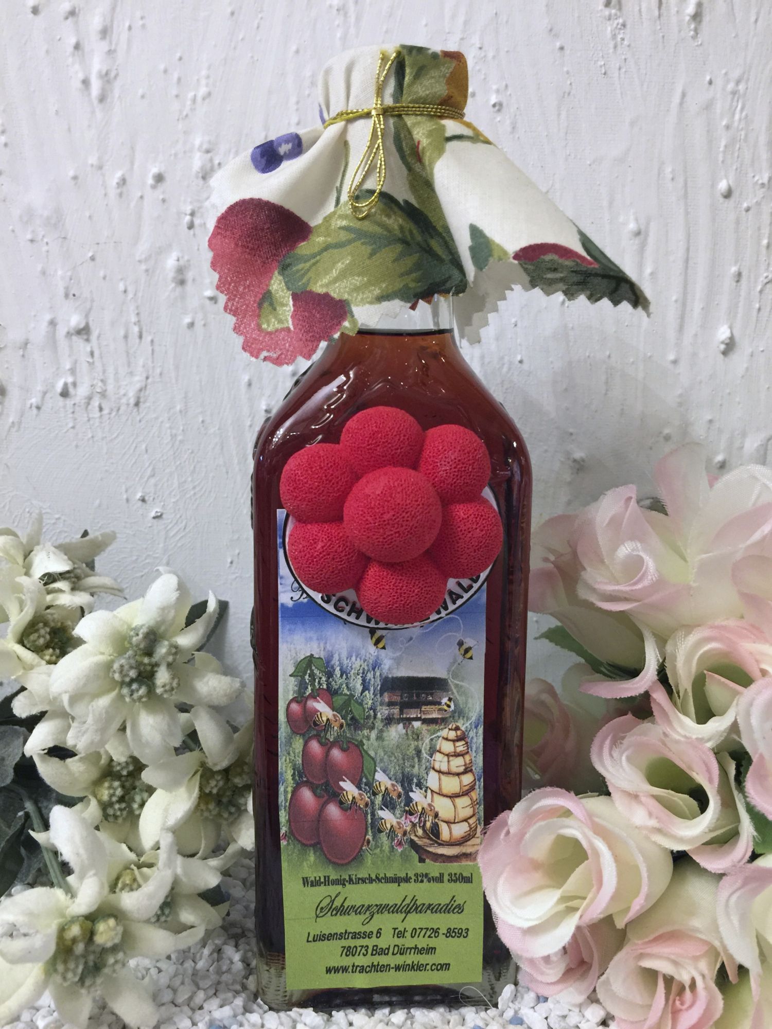 Feinster Waldhonig verfeinert mit edlem Schwarzwälder Kirschlikör. Kreiert zu einem feinen leckeren Honig-Kirsch Schnäpsle.