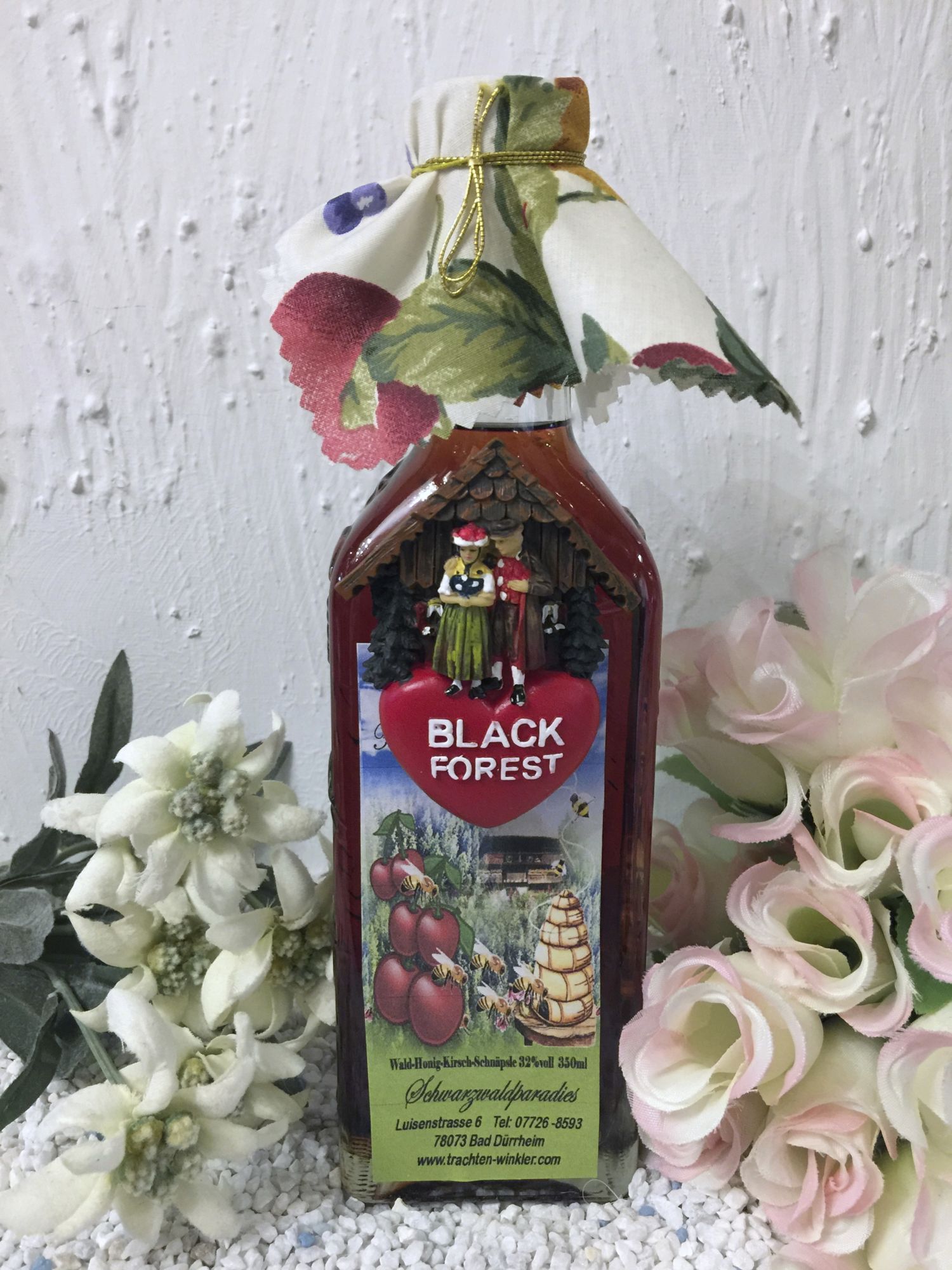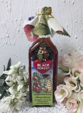Abgefüllt in der schönen traditionellen Schwarzwaldflasche mit Schwarzwaldmotiven.
