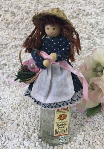Kleine gefertigte Püppchen aus Holz,Stroh und Stoff ziehren ein kleines Schnapsfläschle.