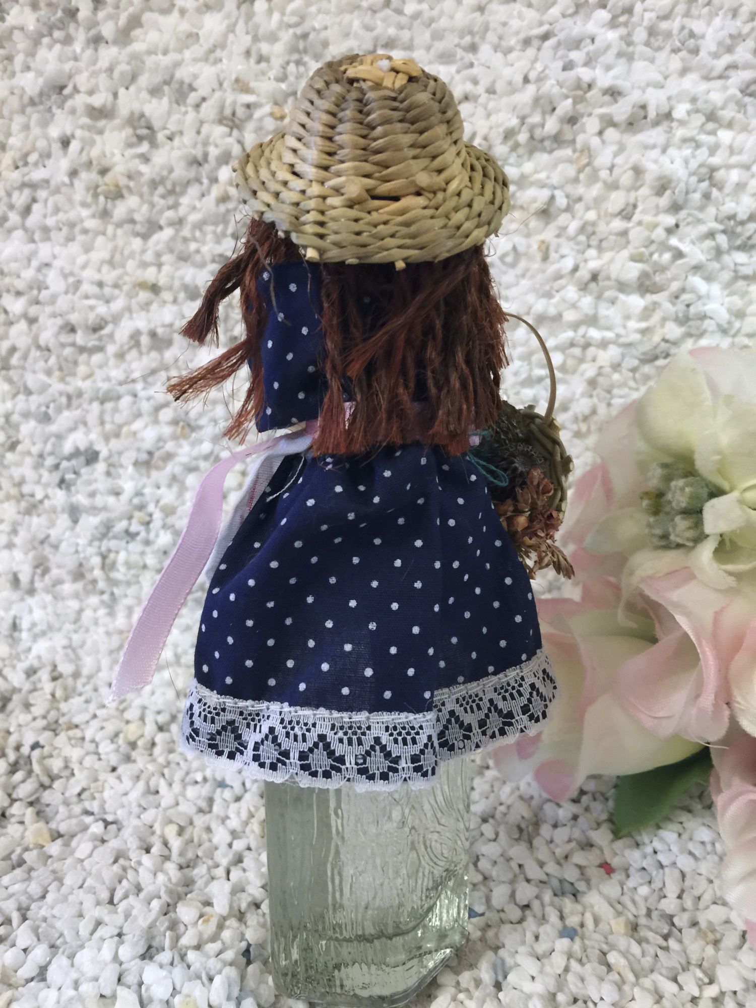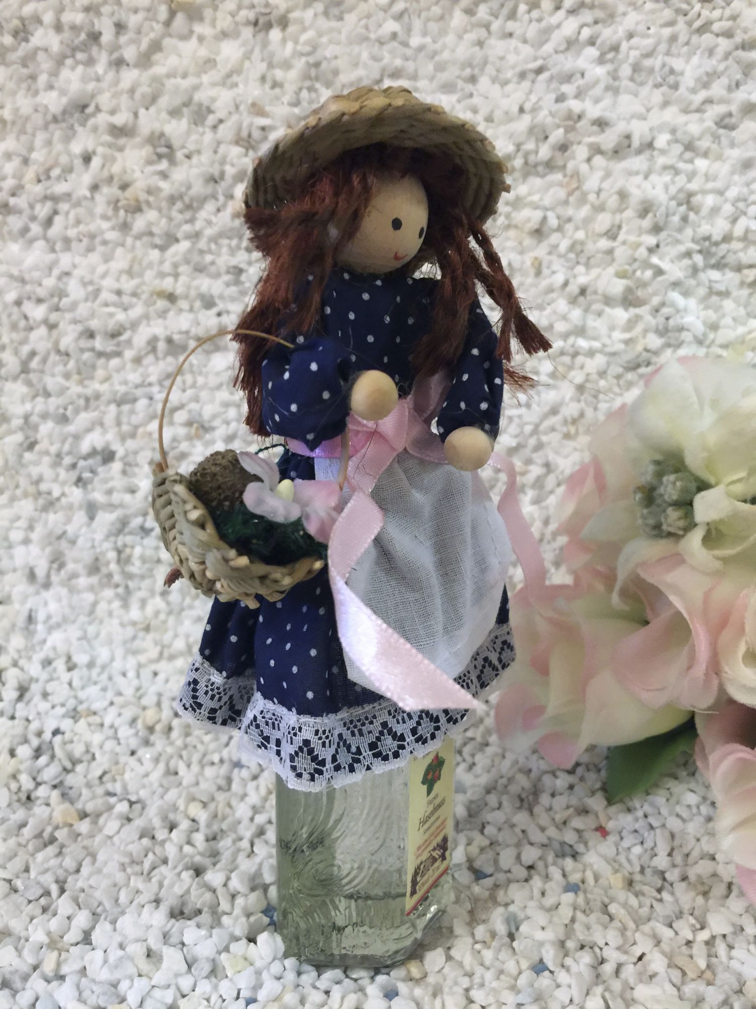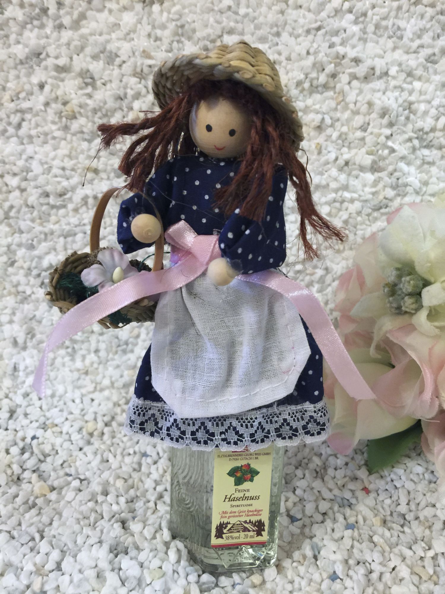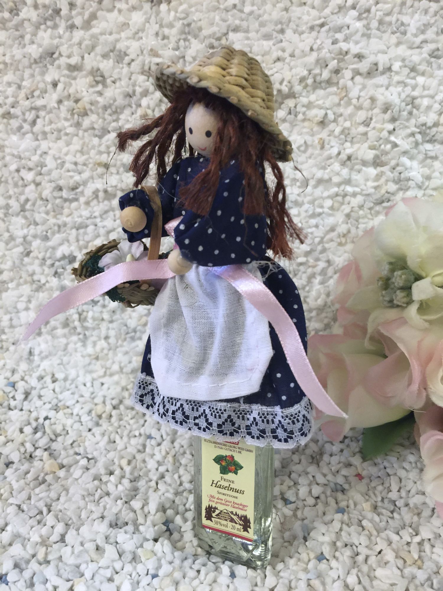Kleine gefertigte Püppchen aus Holz,Stroh und Stoff ziehren ein kleines Schnapsfläschle.