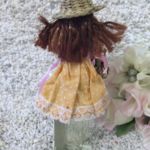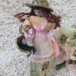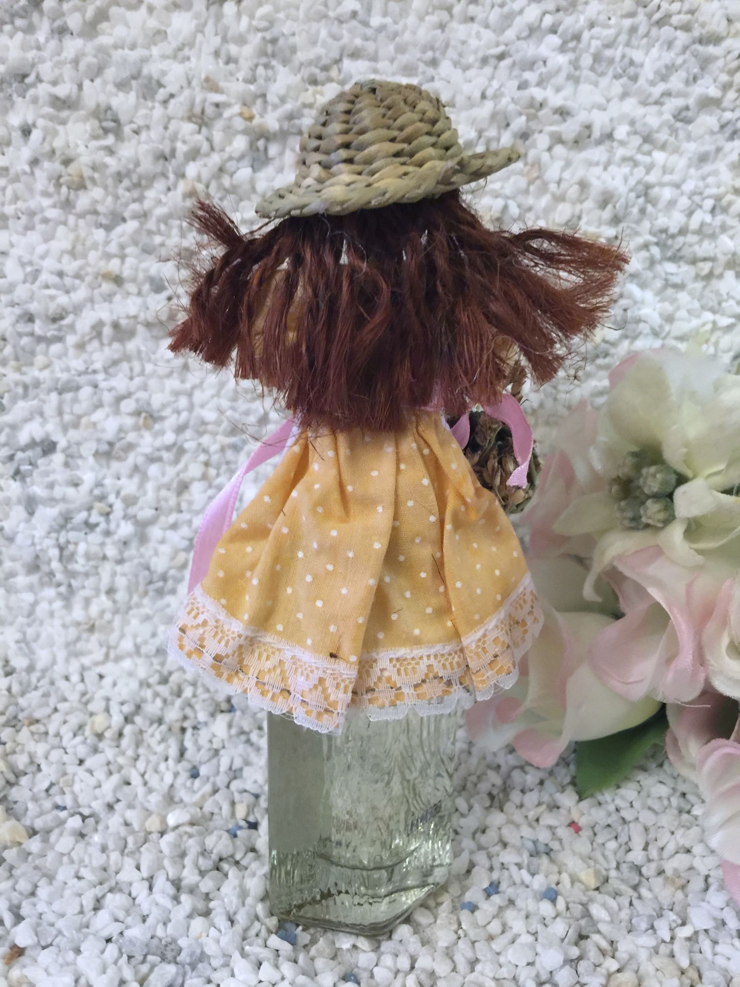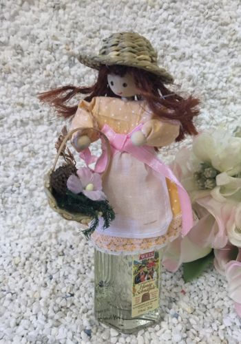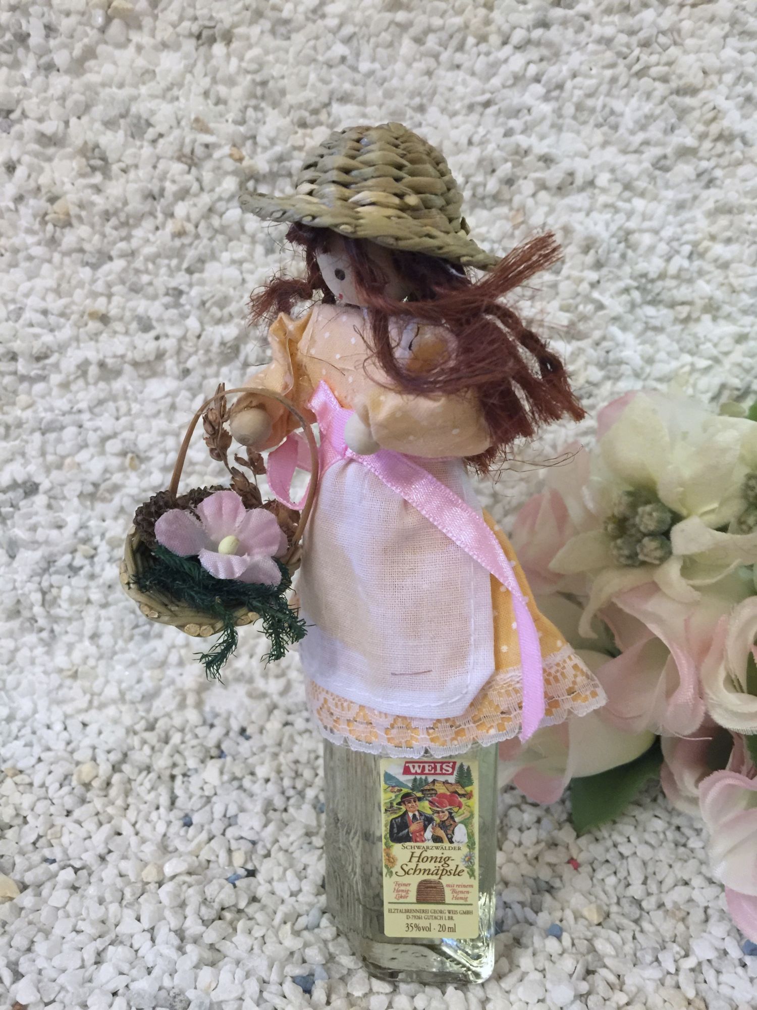 Kleine gefertigte Püppchen aus Holz,Stroh und Stoff ziehren ein kleines Schnapsfläschle.