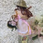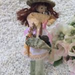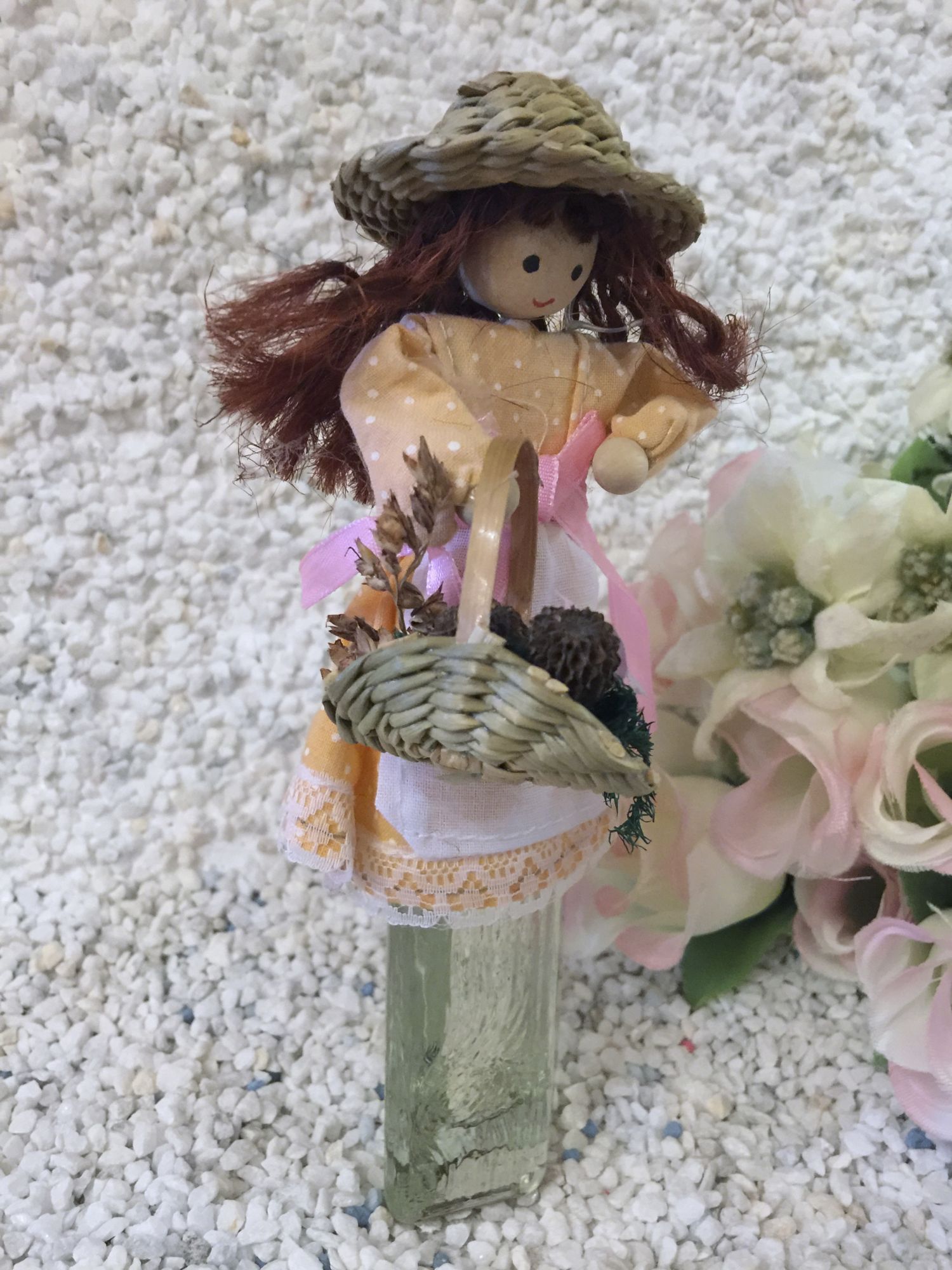 Liebevoll von Hand gestaltete Püppchen mit einem Holzkopf, Haaren, Stoffkleidchen und einem Geschenkkorb.