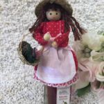 Liebevoll von Hand gestaltete Püppchen mit einem Holzkopf, Haaren, Stoffkleidchen und einem Geschenkkorb.