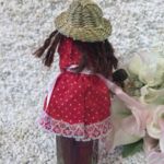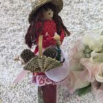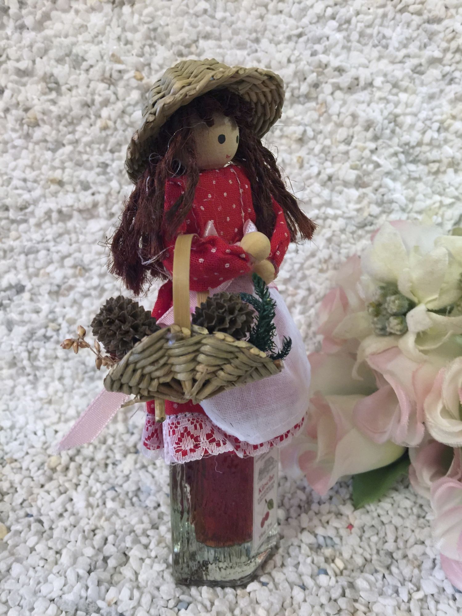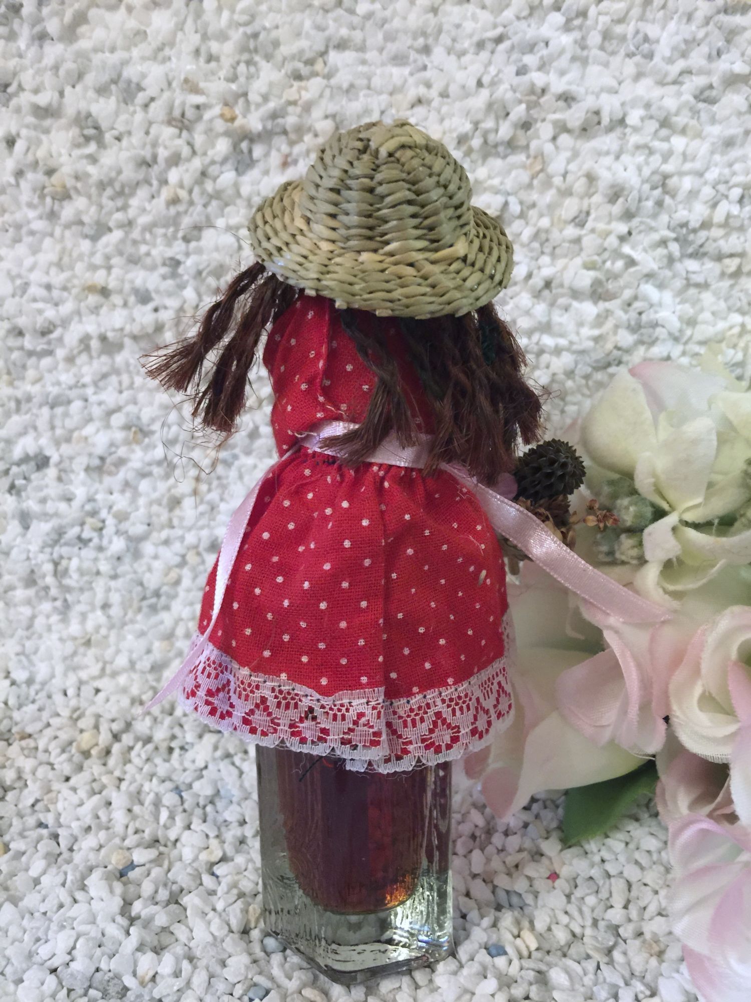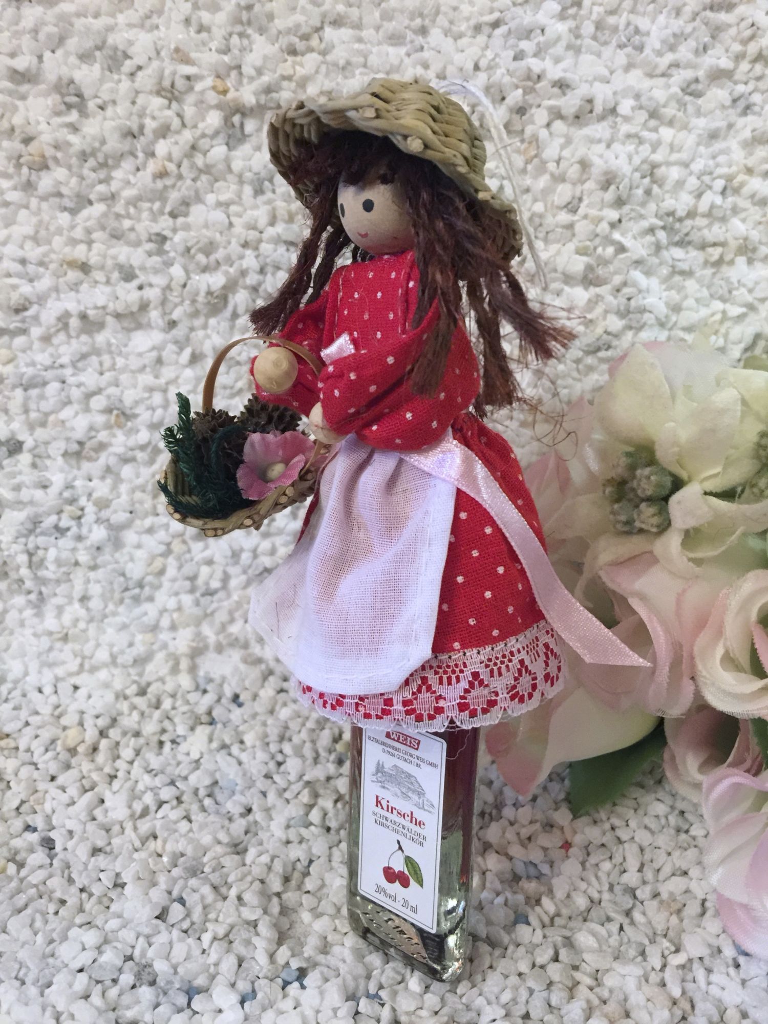 Kleine gefertigte Püppchen aus Holz,Stroh und Stoff ziehren ein kleines Schnapsfläschle.